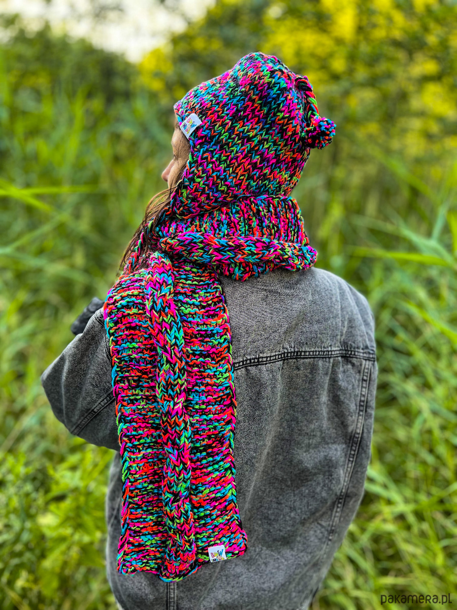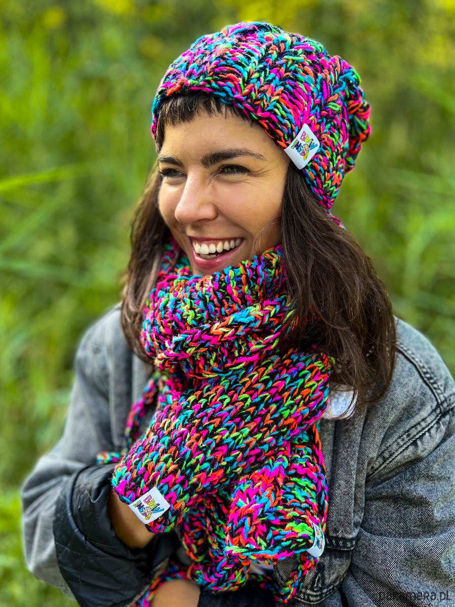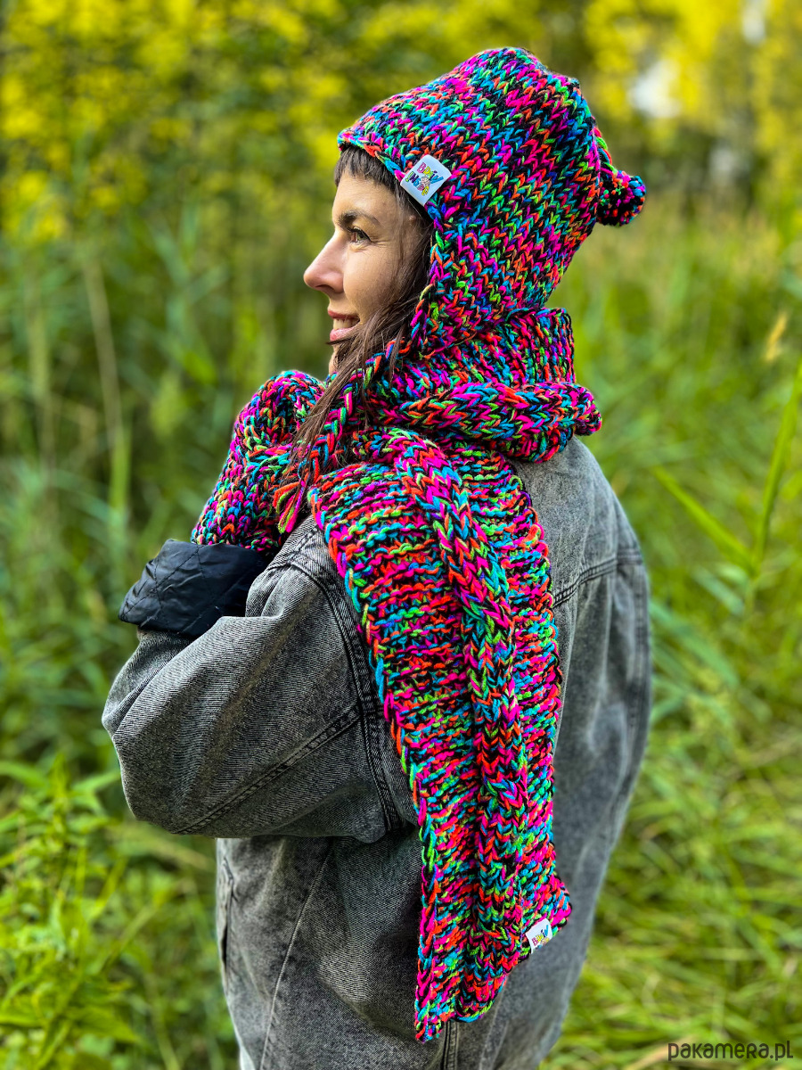 Ma około 180 cm, więc możesz go nonszalancko przerzucić przez ramię, owinąć kilka razy wokół szyi albo puścić luźno jak modowy manifest. Ręcznie robiony na drutach przez Seniorki z Poznania, powstaje z mieszanki 34% merino i 66% akrylu – dzięki temu jest miękki, ciepły i praktyczny jednocześnie.