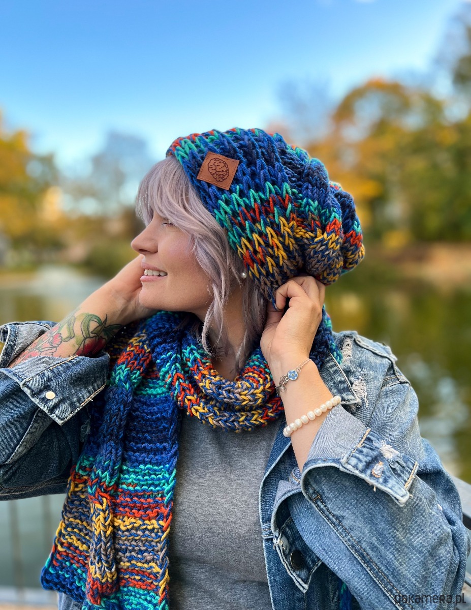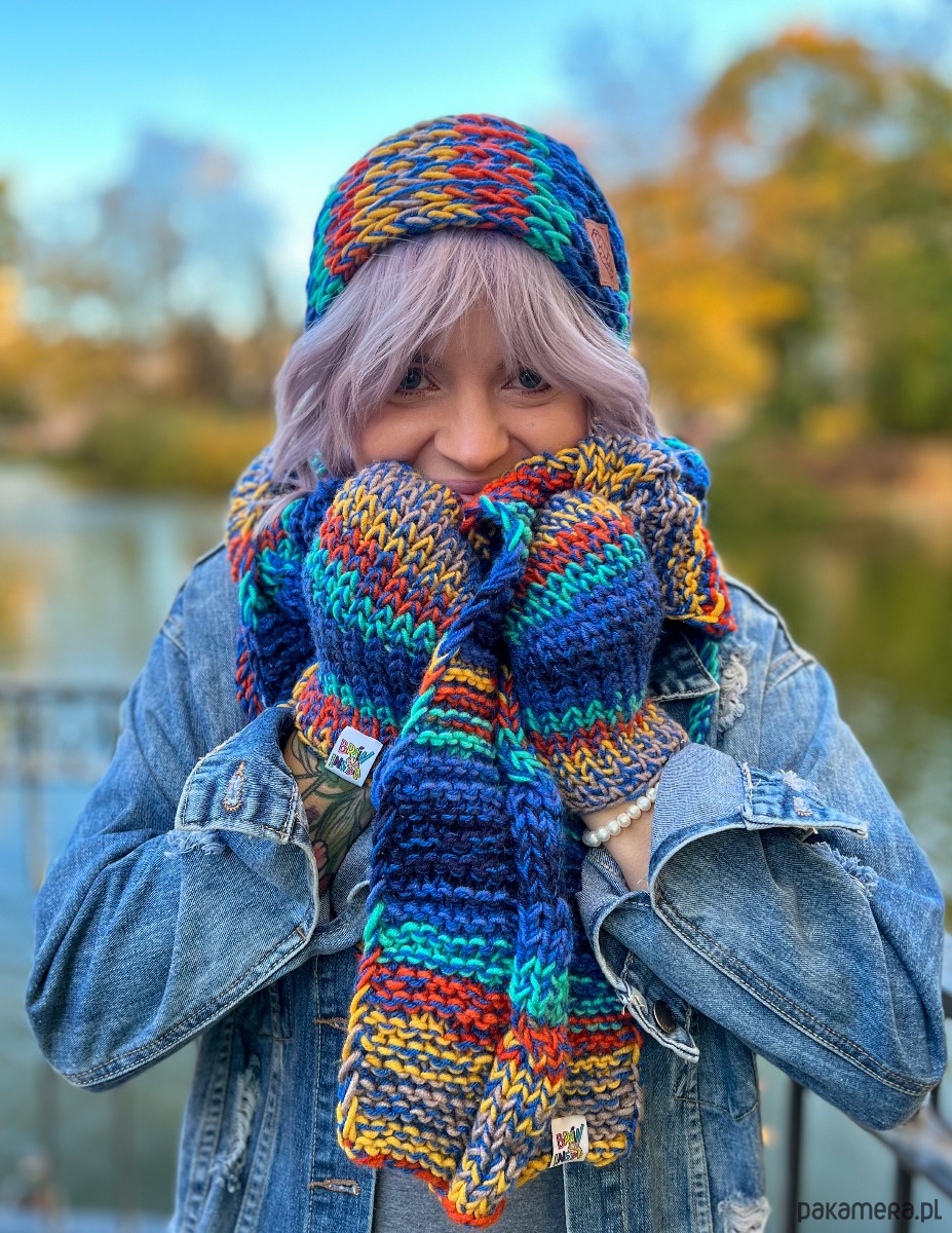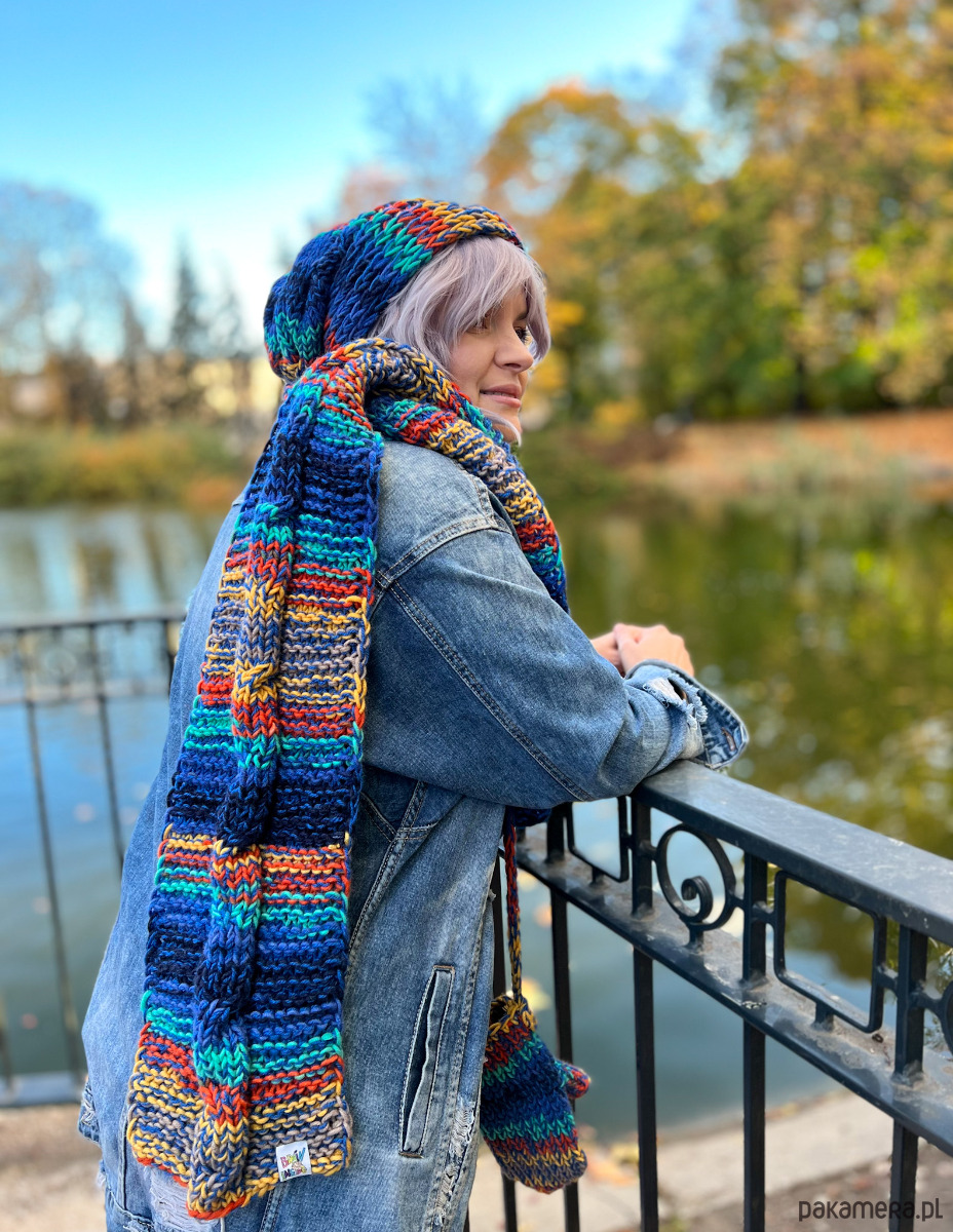 Ma około 180 cm, więc możesz go nonszalancko przerzucić przez ramię, owinąć kilka razy wokół szyi albo puścić luźno jak modowy manifest. Ręcznie robiony na drutach przez Seniorki z Poznania, powstaje z mieszanki 50% merino i 50% akrylu – dzięki temu jest miękki, ciepły i praktyczny jednocześnie.