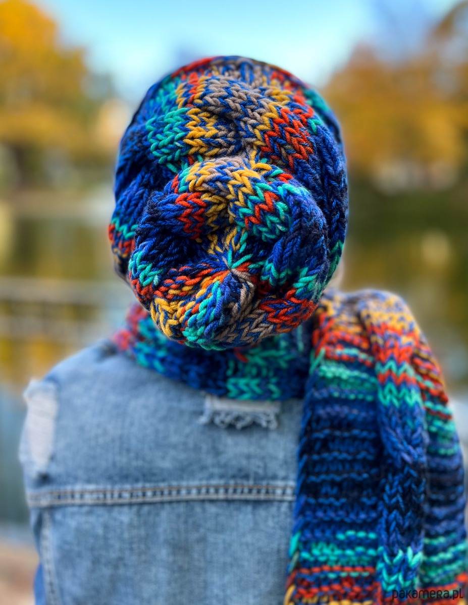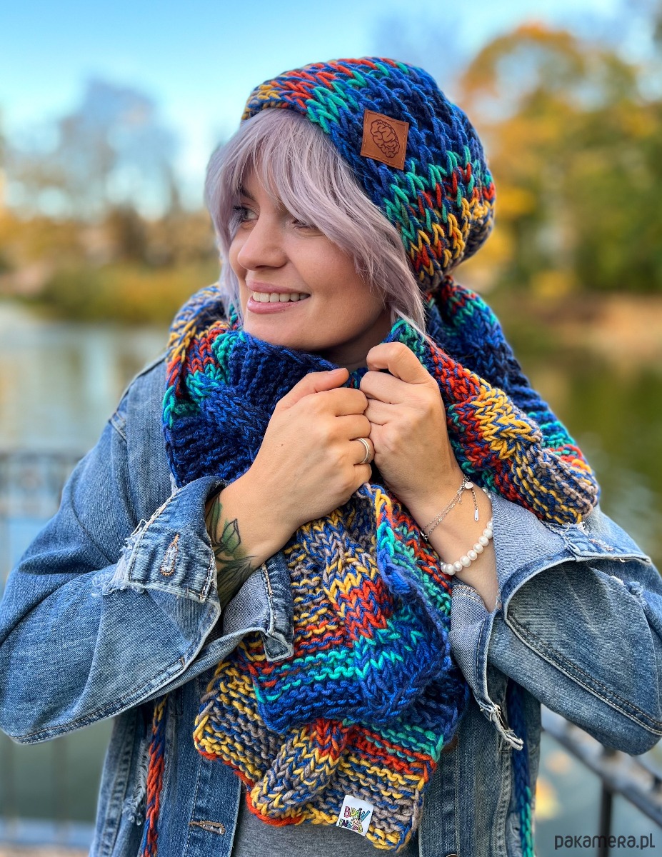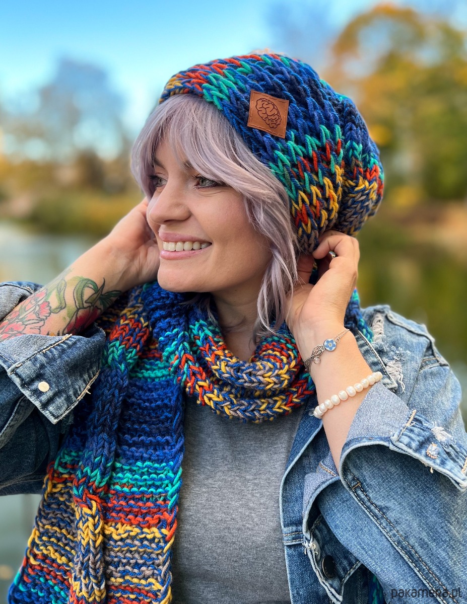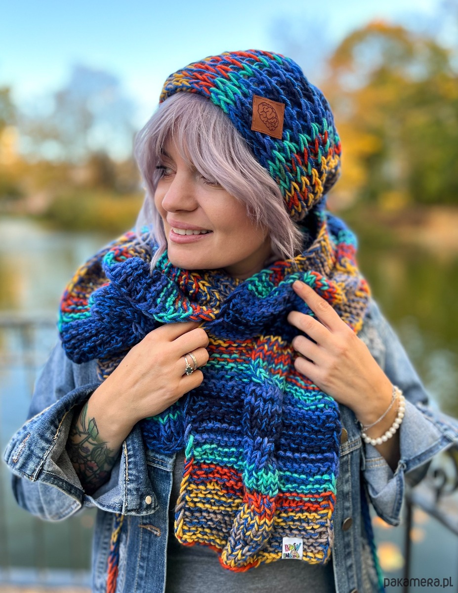 Ma około 180 cm, więc możesz go nonszalancko przerzucić przez ramię, owinąć kilka razy wokół szyi albo puścić luźno jak modowy manifest. Ręcznie robiony na drutach przez Seniorki z Poznania, powstaje z mieszanki 50% merino i 50% akrylu – dzięki temu jest miękki, ciepły i praktyczny jednocześnie.