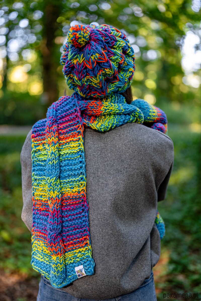 Ma około 180 cm, więc możesz go nonszalancko przerzucić przez ramię, owinąć kilka razy wokół szyi albo puścić luźno jak modowy manifest. Ręcznie robiony na drutach przez Seniorki z Poznania, powstaje z mieszanki 50% merino i 50% akrylu – dzięki temu jest miękki, ciepły i praktyczny jednocześnie.