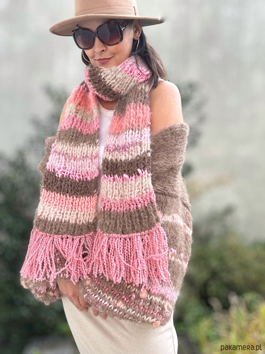 Szal ma około 180 cm długości plus frędzle i jest luźno splatany.