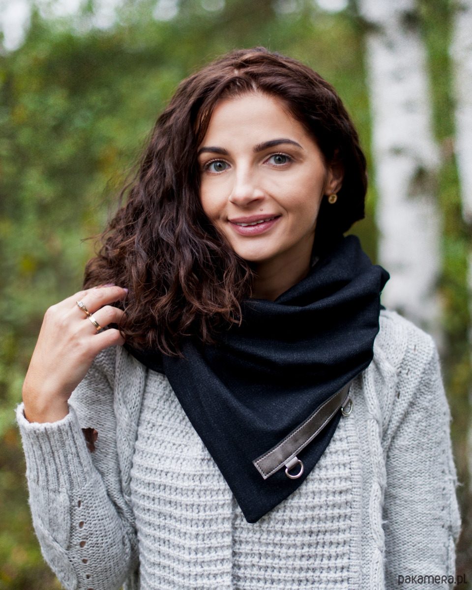 Bardzo starannie wykonany szal zapinany na 3 karabińczyki. Szal zostały wykonany z 2 warstw miłej w dotyku czarnej wełny. Szal zdobiony jest naturalną srebrzystą skórą oraz metalowymi zapięciami.