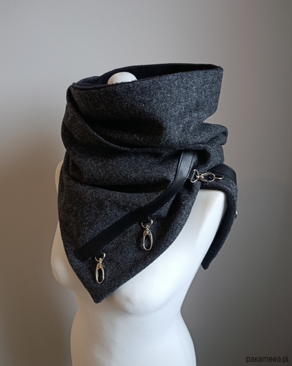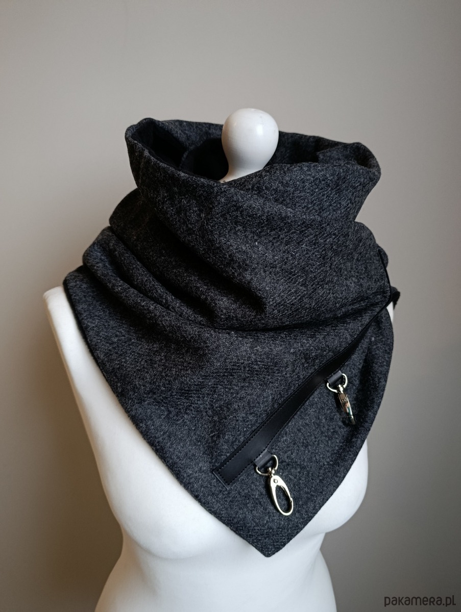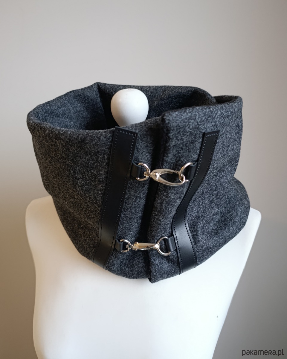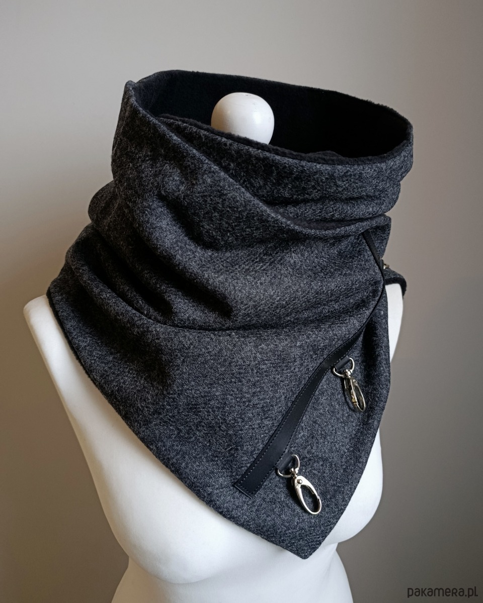 Bardzo starannie wykonany szal zapinany na 3 karabińczyki. Szal zostały wykonany z 2 warstw materiału - wierzchnia- grafitowa tkanina wełniana, spód z czarnego, miłego w dotyku polaru. Szal zdobiony jest naturalną, gładką, czarną skórą oraz metalowymi zapięciami.