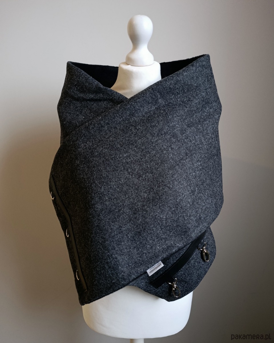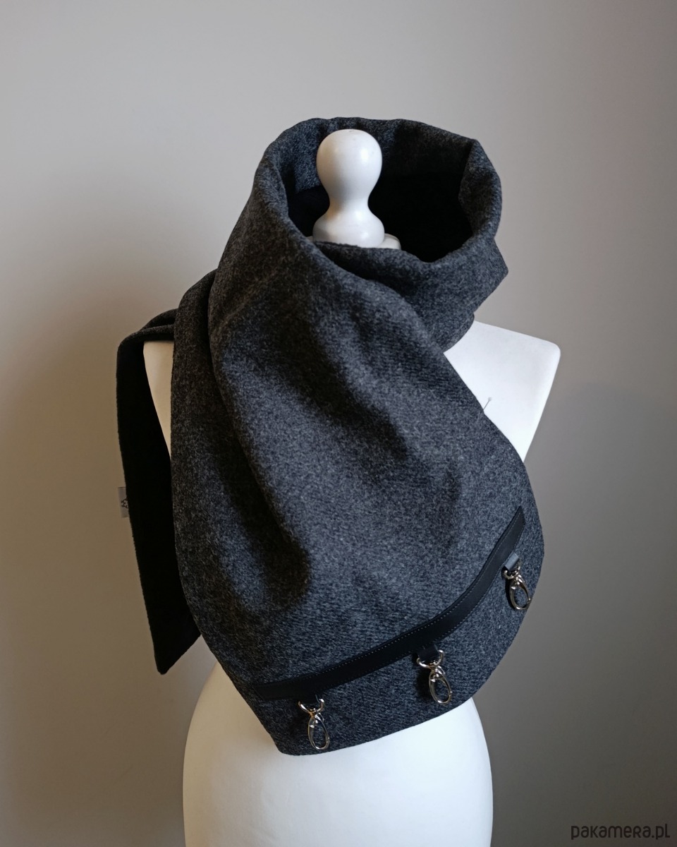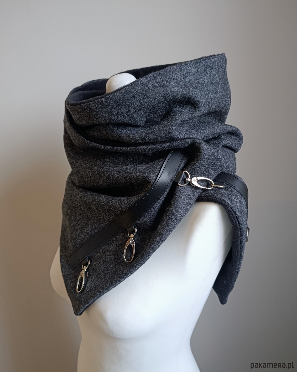 Bardzo starannie wykonany szal zapinany na 3 karabińczyki. Szal zostały wykonany z 2 warstw materiału - wierzchnia- grafitowa tkanina wełniana, spód z czarnego, miłego w dotyku polaru. Szal zdobiony jest naturalną, gładką, czarną skórą oraz metalowymi zapięciami.