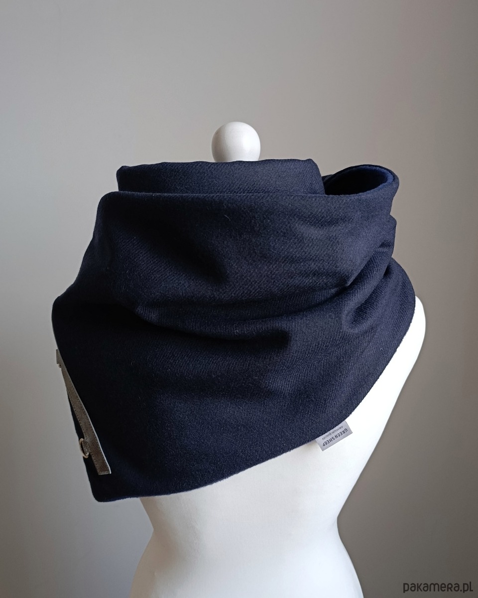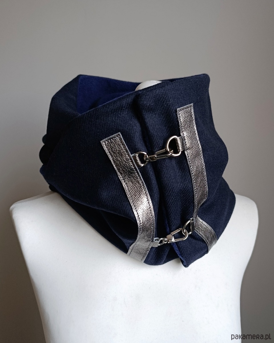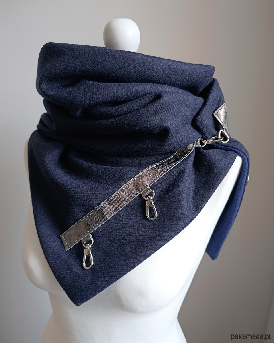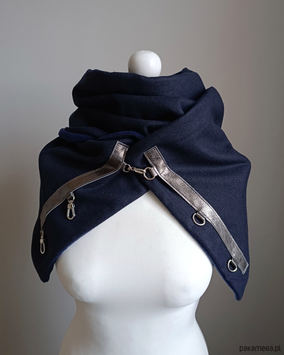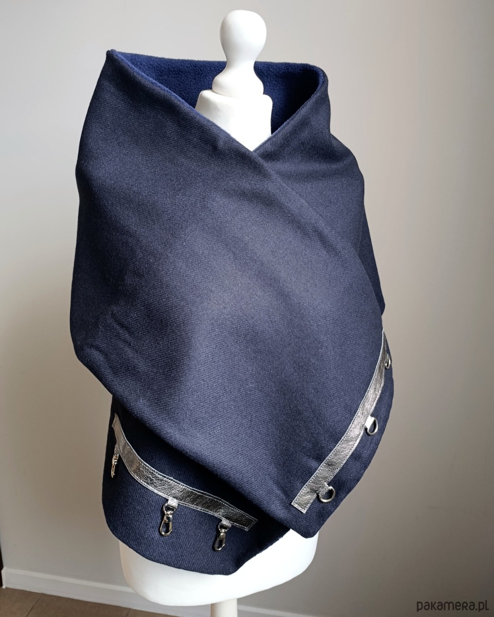 Bardzo starannie wykonany szal zapinany na 3 karabińczyki. Szal zostały wykonany z 2 warstw materiału - wierzchnia- granatowa tkanina wełniana, spód z granatowego, miłego w dotyku polaru. Szal zdobiony jest naturalną, srebrzystą, metaliczną skórą oraz metalowymi zapięciami.