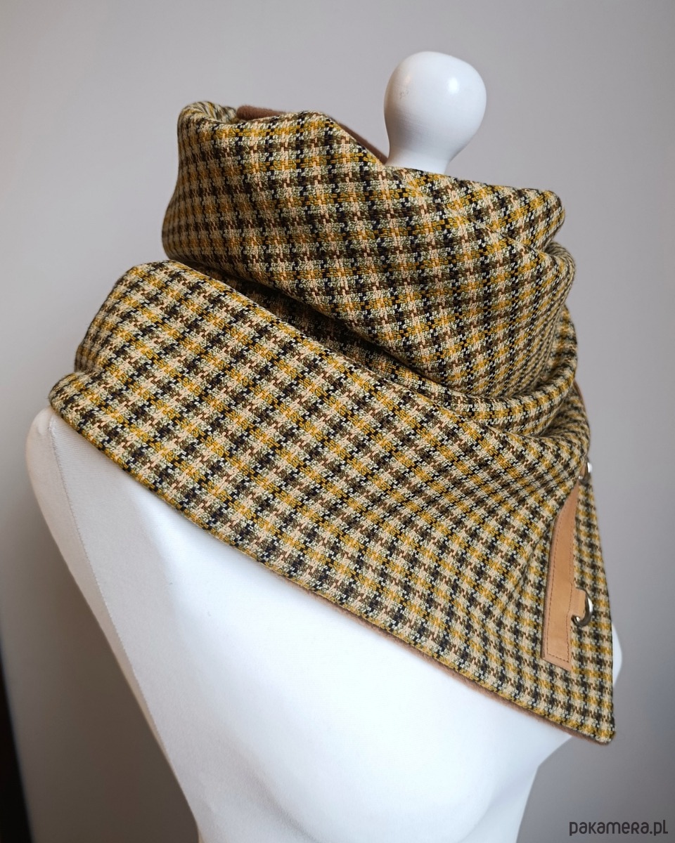 Bardzo starannie wykonany szal zapinany na 3 karabińczyki. Szal zostały wykonany z 2 warstw materiału - wierzchnia- kraciasta tkanina wełniana w kolorach: zielony, musztardowy, beżowy, brązowy. Spód z, miłego w dotyku polaru w pasującym kolorze- toffi.. Szal zdobiony jest naturalną skórą oraz metalowymi zapięciami.