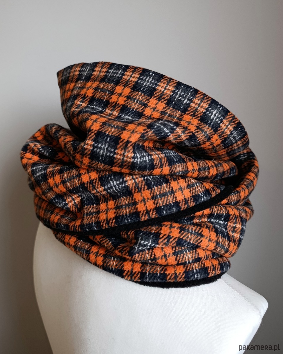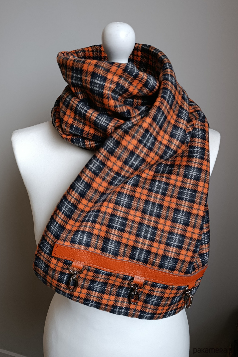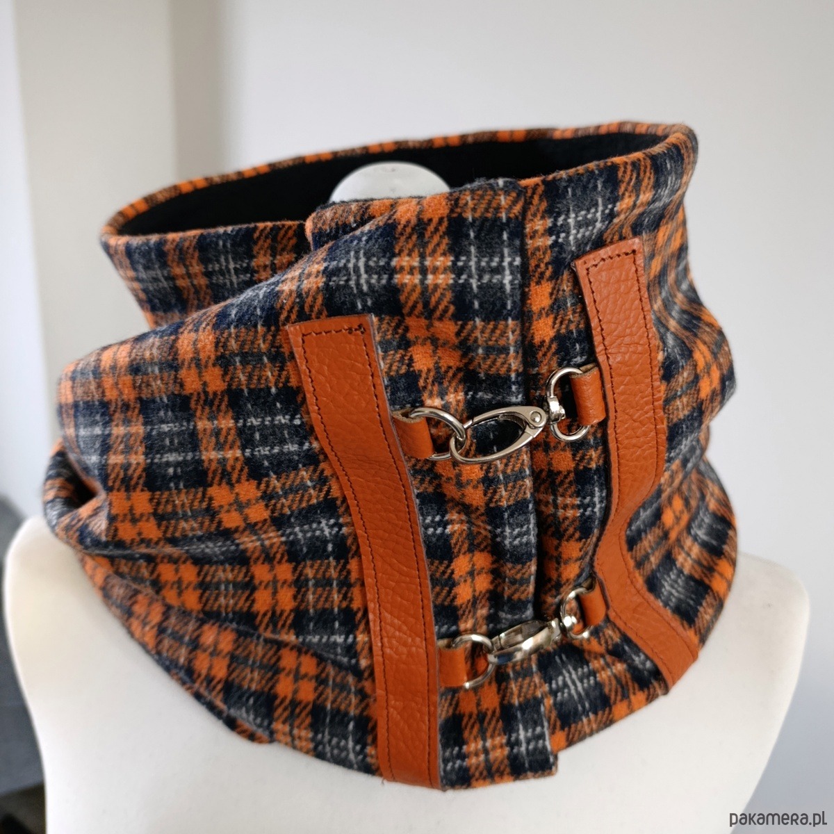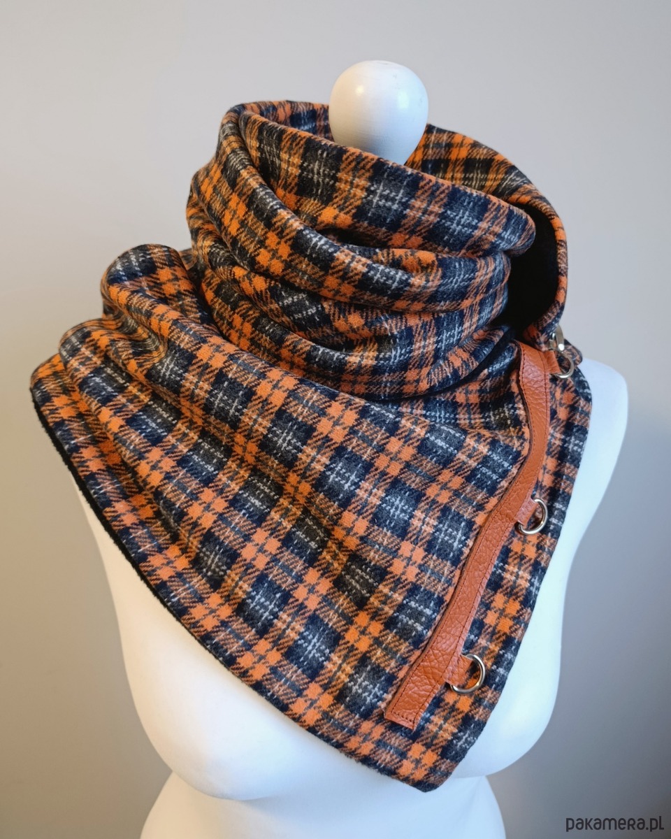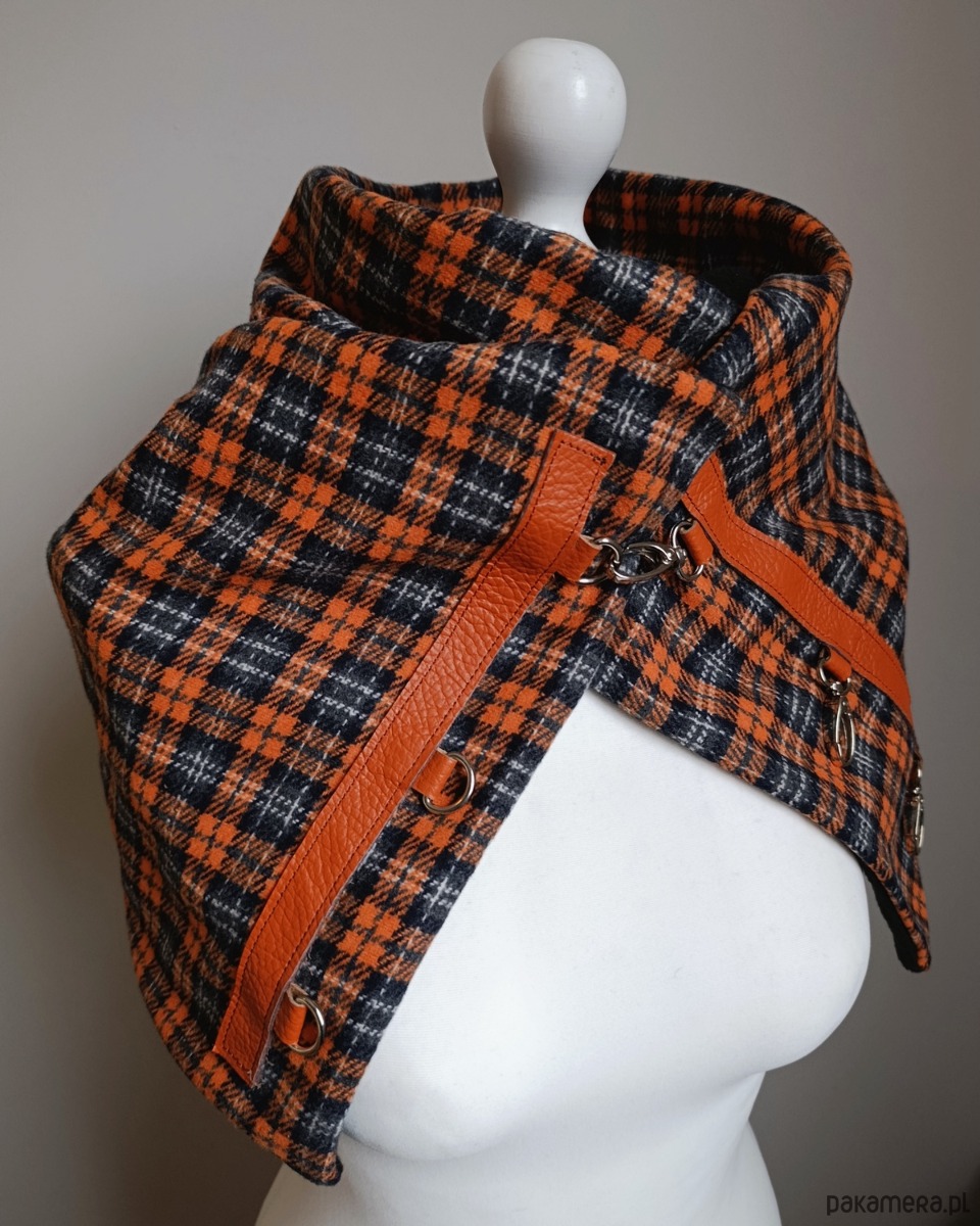 Bardzo starannie wykonany szal zapinany na 3 karabińczyki. Szal zostały wykonany z 2 warstw materiału - wierzchnia- kraciasta tkanina wełniana w kolorach: pomarańczowy, szary, czarny. Spód z czarnego, miłego w dotyku polaru. Szal zdobiony jest naturalną, pomarańczową skórą oraz metalowymi zapięciami.