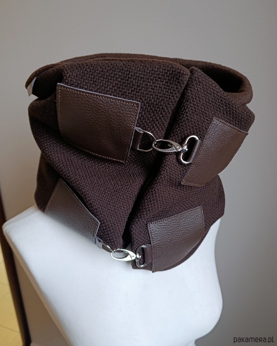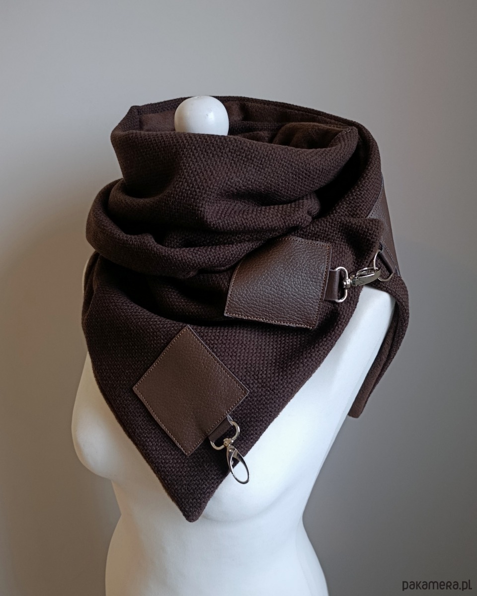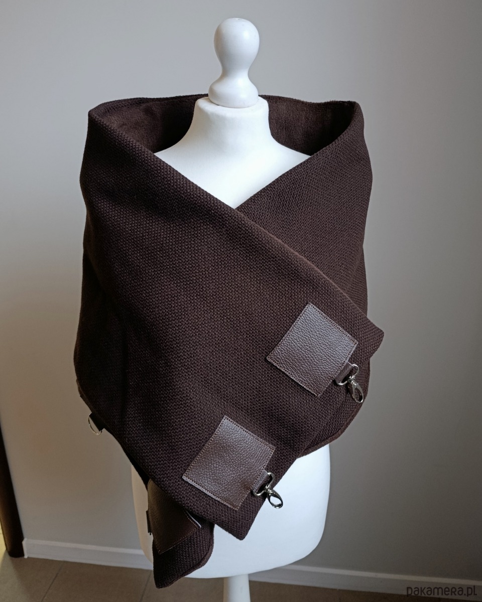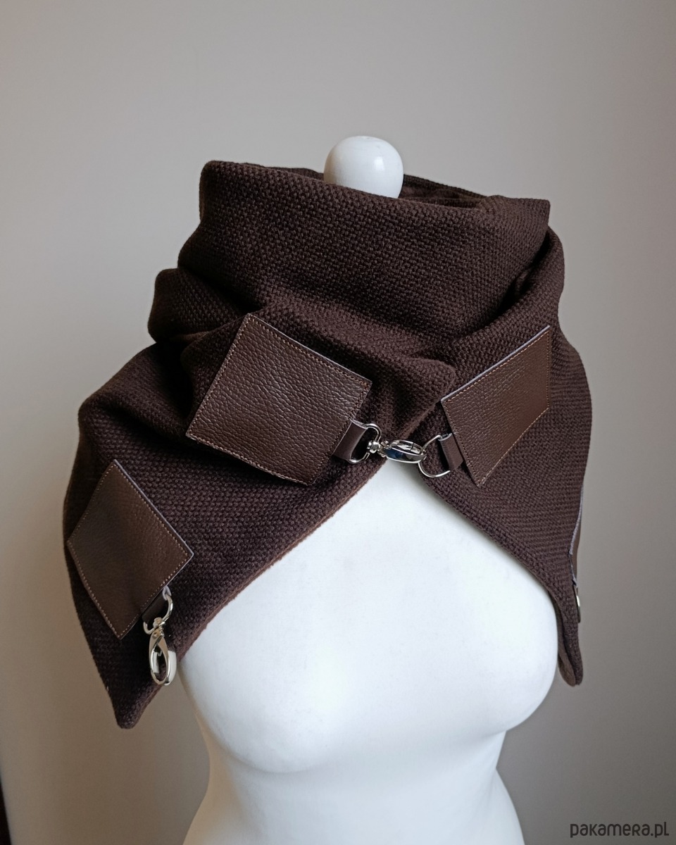 Bardzo starannie wykonany szal zapinany na 2 karabińczyki. Szal zostały wykonany z 2 warstw materiału - wierzchnia - brązowa, włoska wełna, spód z brązowego, miłego w dotyku polaru. Szal zdobiony jest naturalną skórą oraz metalowymi zapięciami. Skóra bydlęca, świetnej jakości.