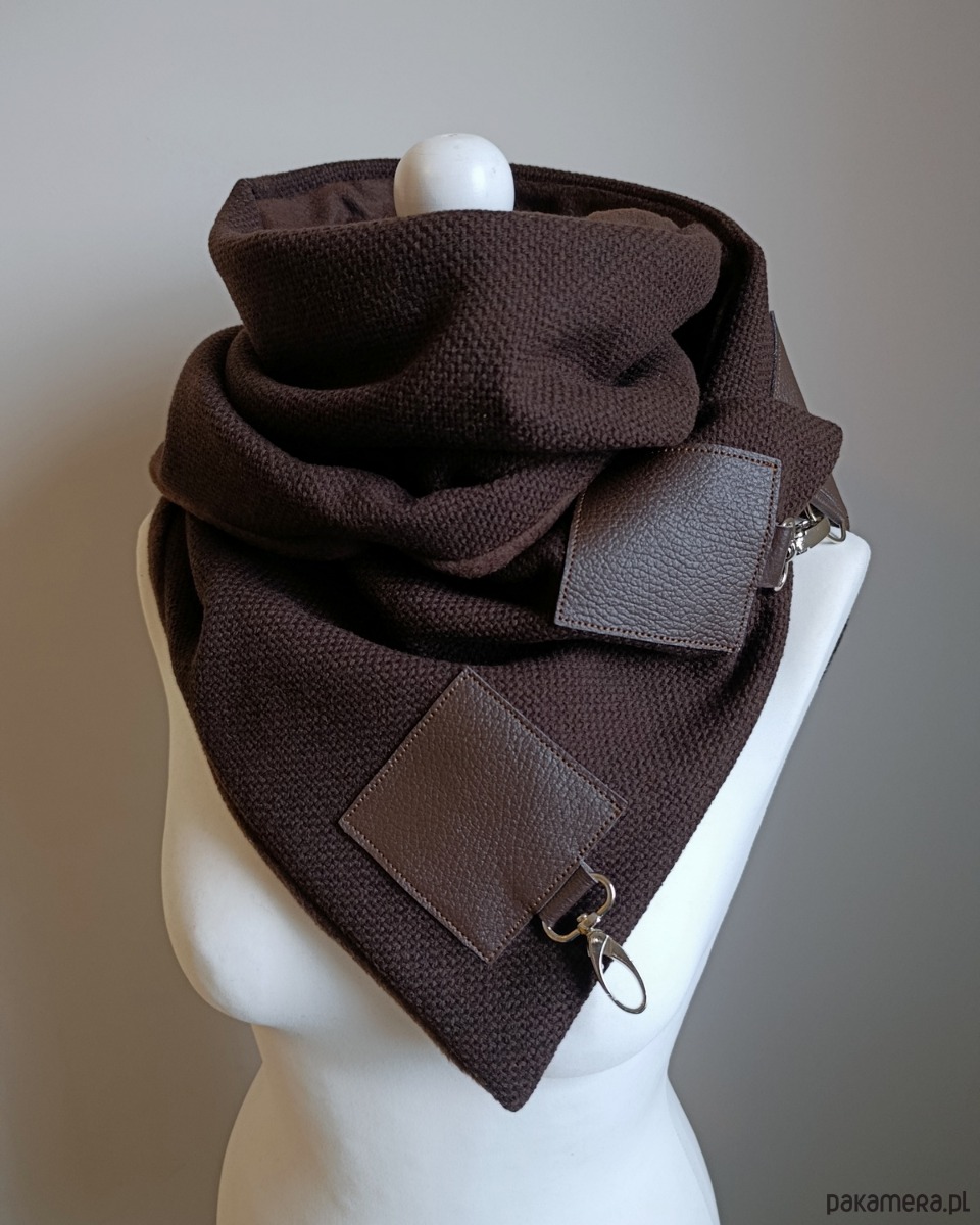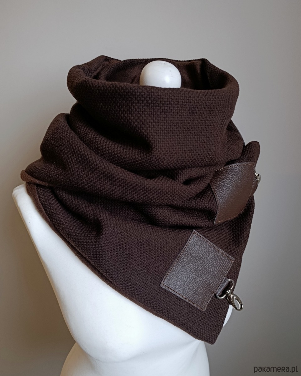 Szal wełniany ze skórą, Komin Unisex Brązowy