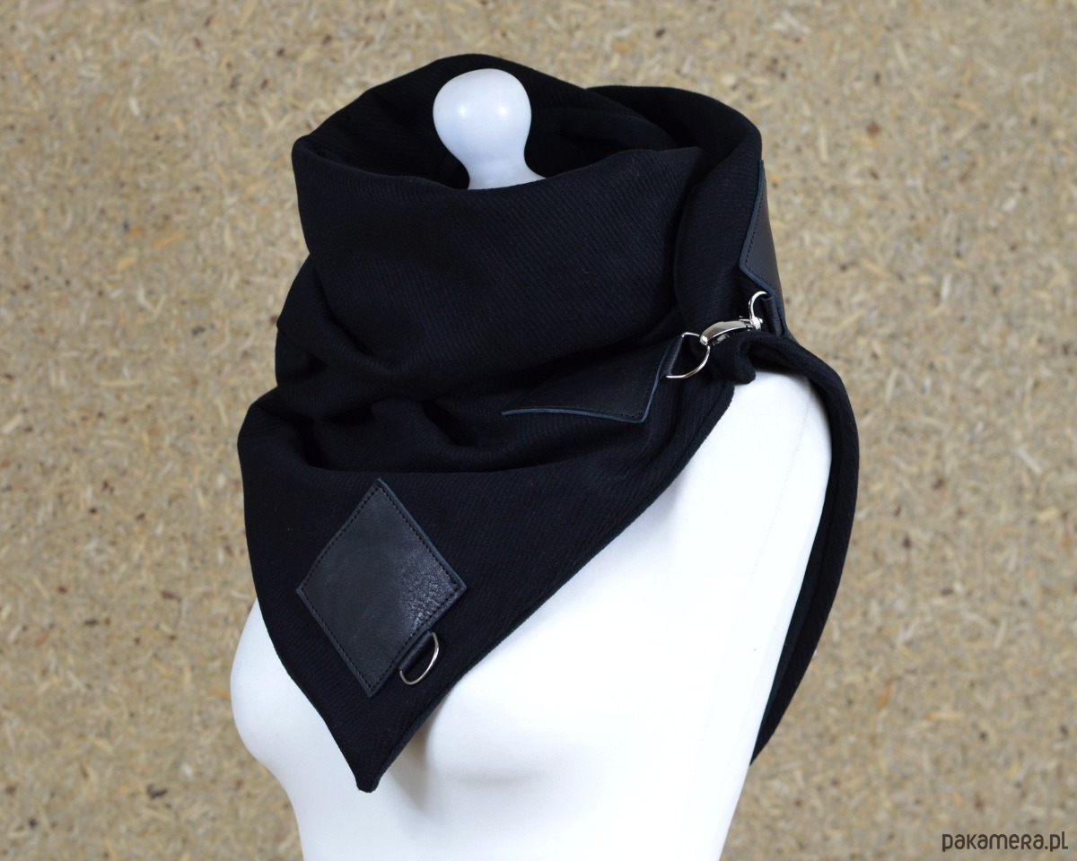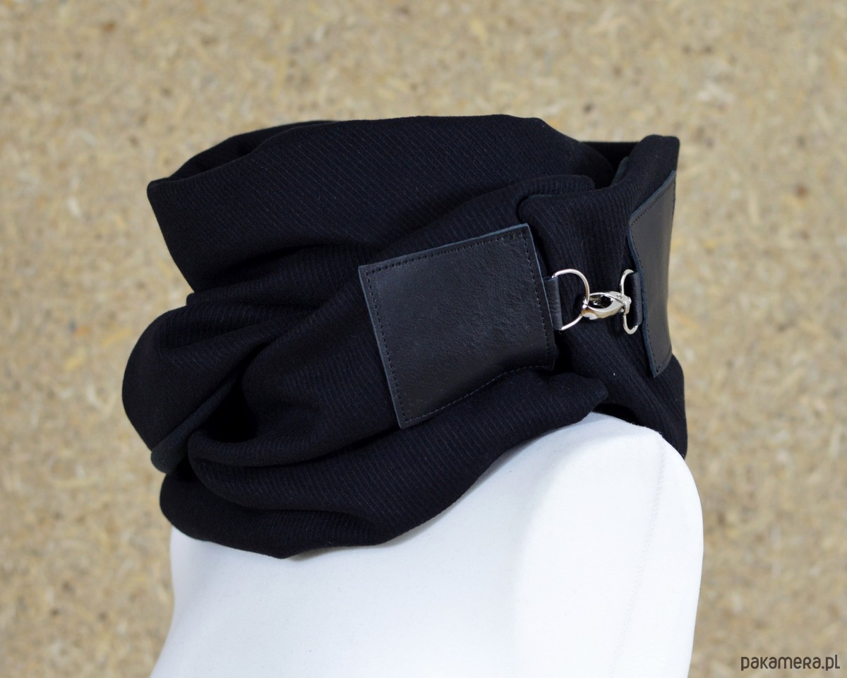 Szal wełniany ze skórą, Komin Unisex - Czarny