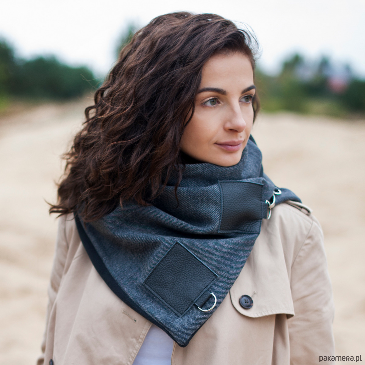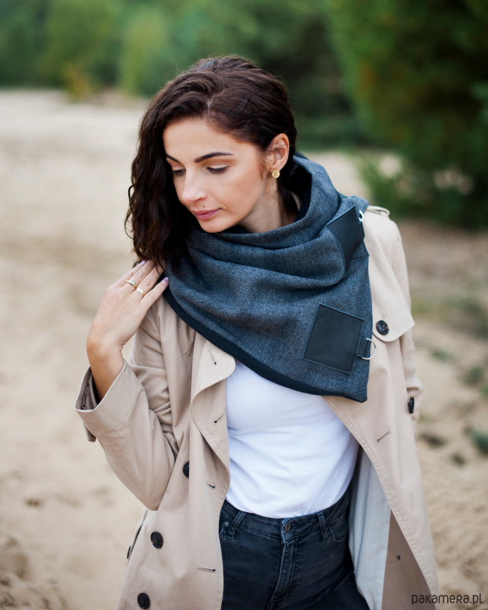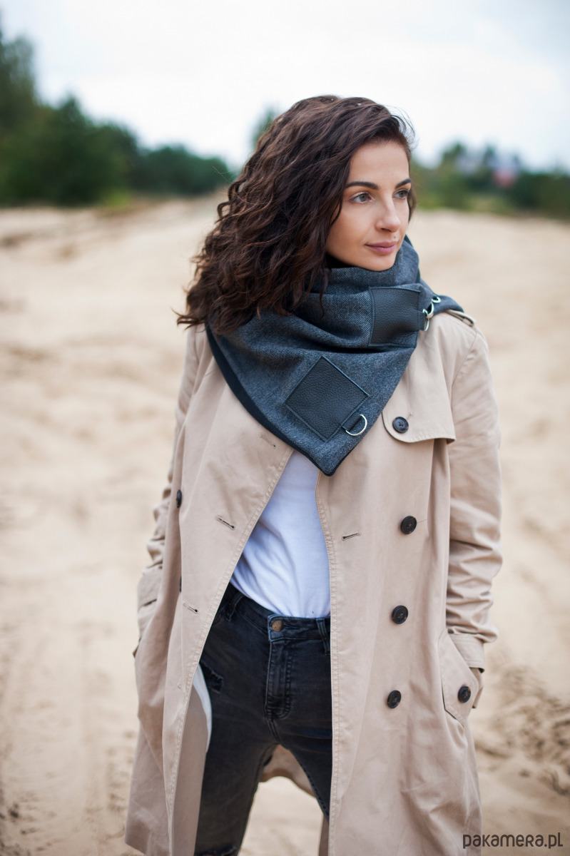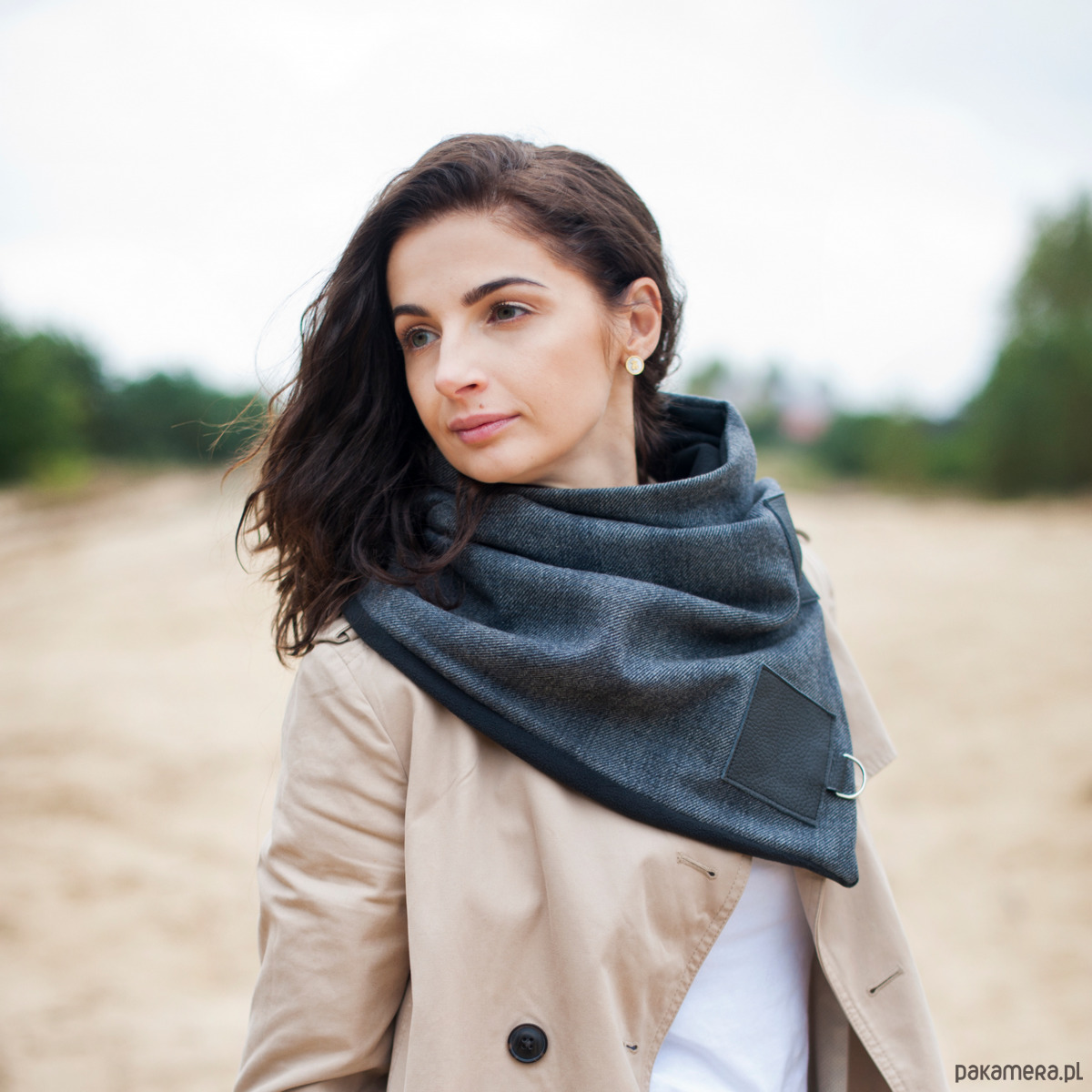 Szal wełniany ze skórą, Komin Unisex Grafitowy