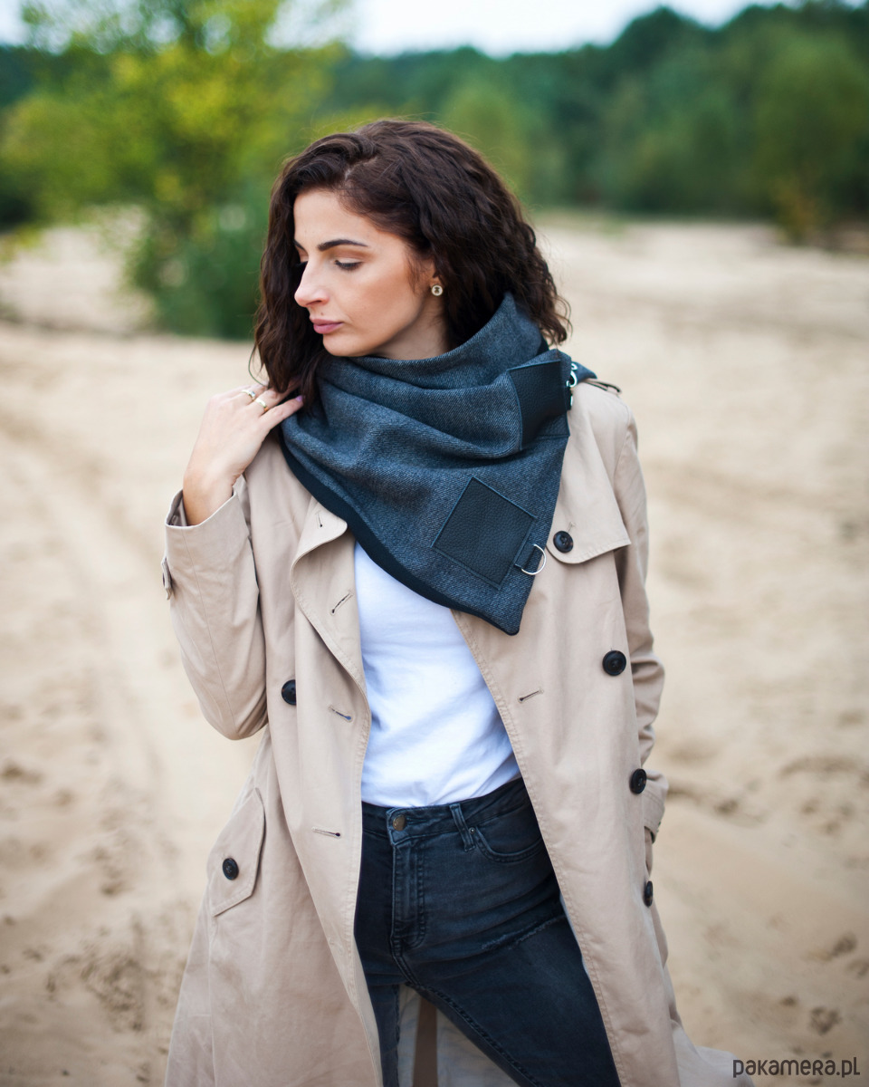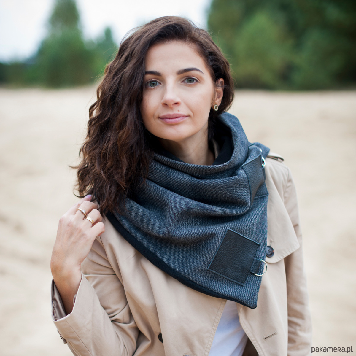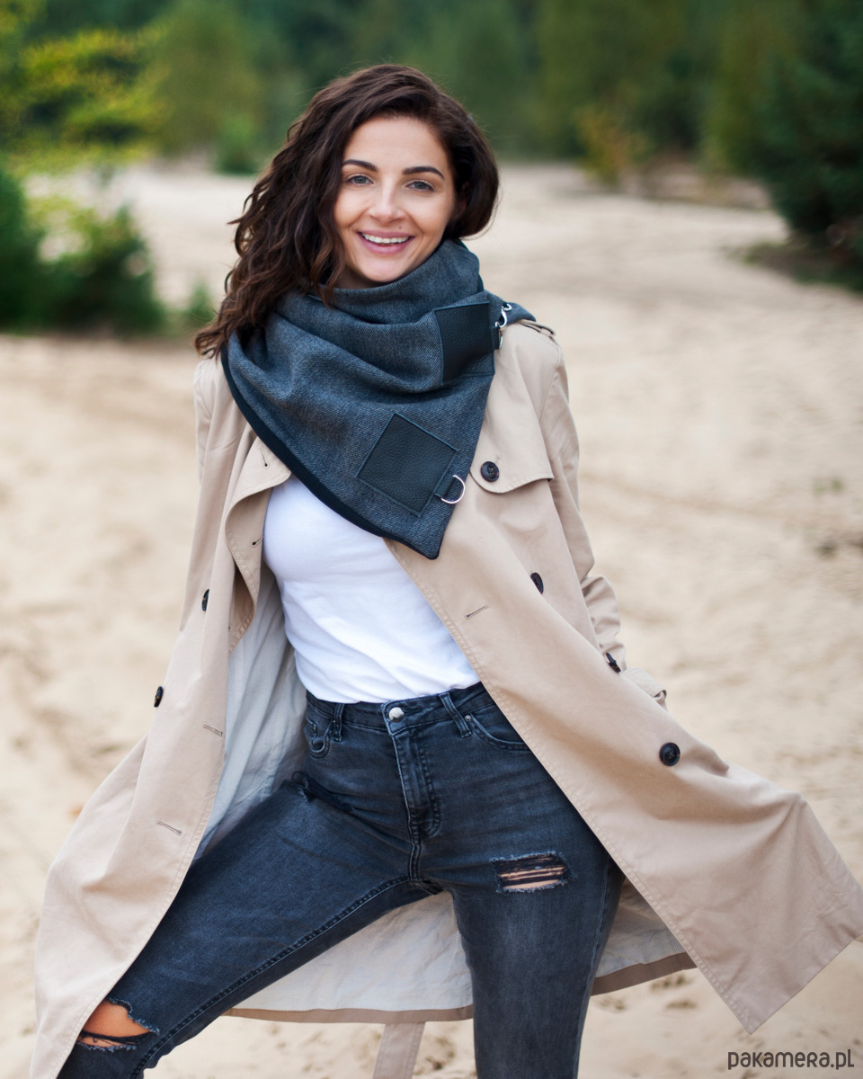 Szal wełniany ze skórą, Komin Unisex Grafitowy