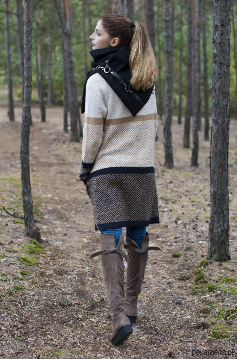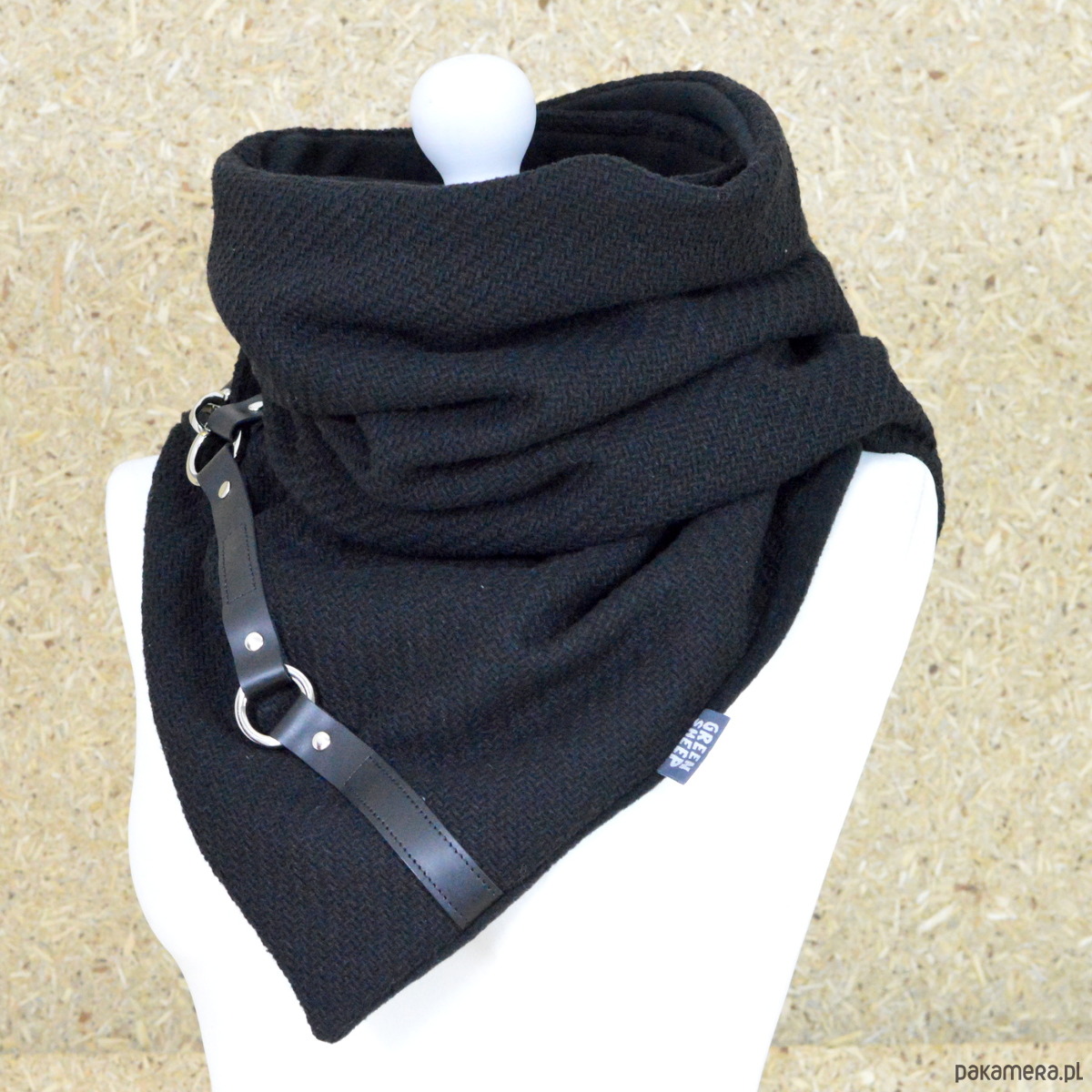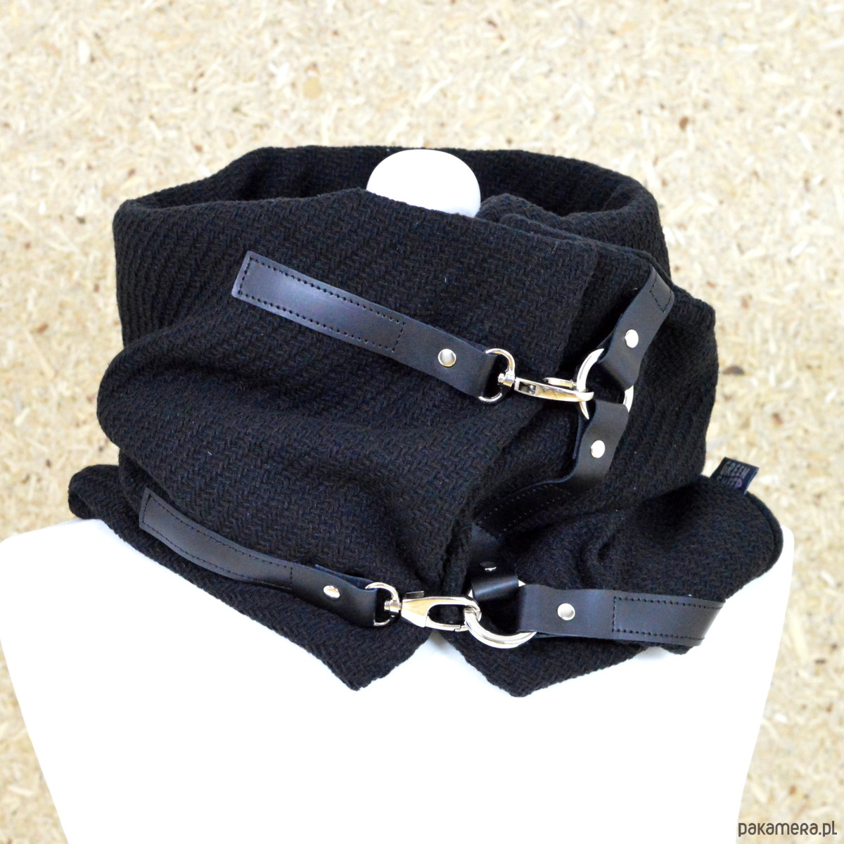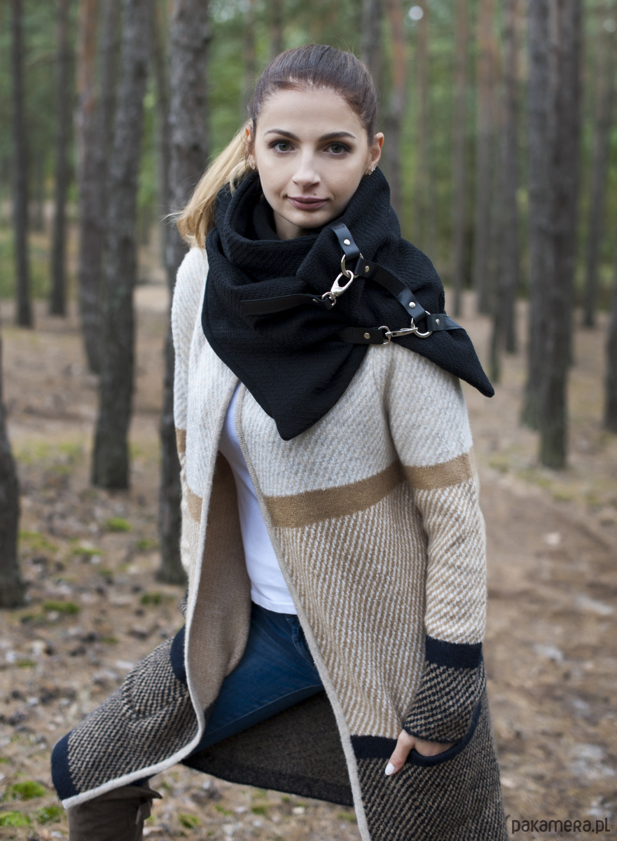 Bardzo starannie wykonany szal zapinany na 2 duże, ładne karabińczyki. Szal zostały wykonany z 2 warstw materiału - wierzchnia - czarna, gruba, włoska wełna z widocznym splotem, spód z czarnego, miłego w dotyku mikropolaru. Szal zdobiony jest naturalną skórą oraz metalowymi kółkami i zapięciami. Produkt zdecydowanie z charakterem ;)