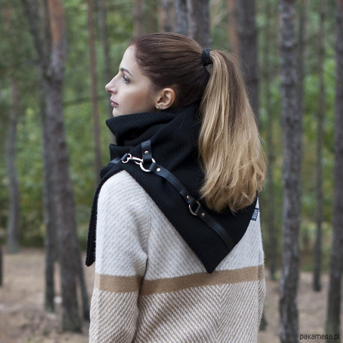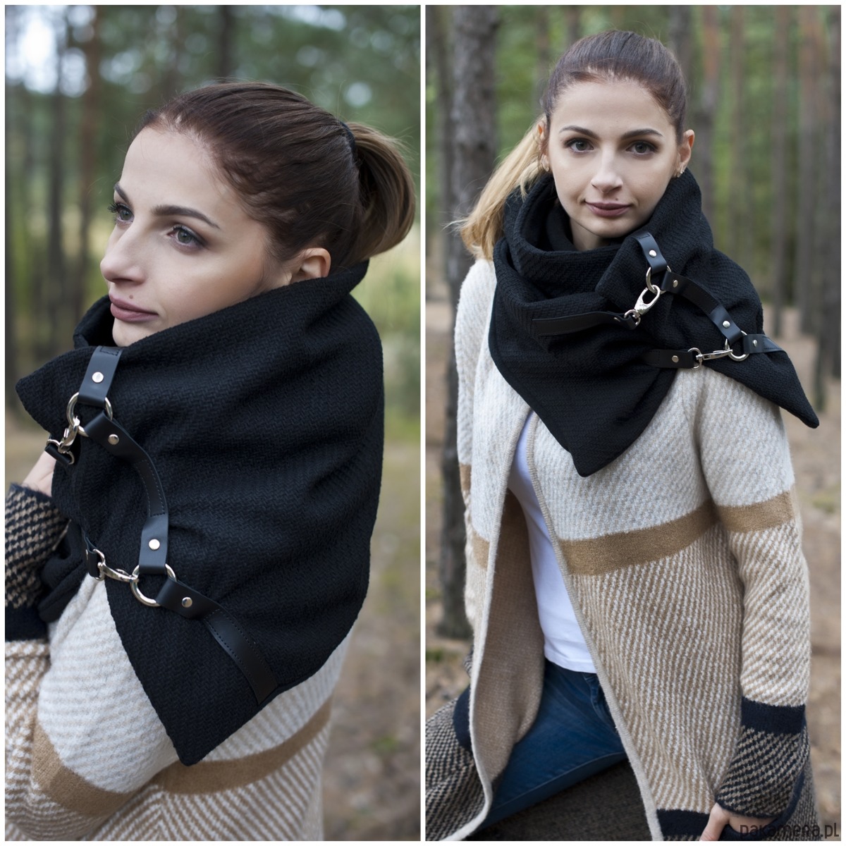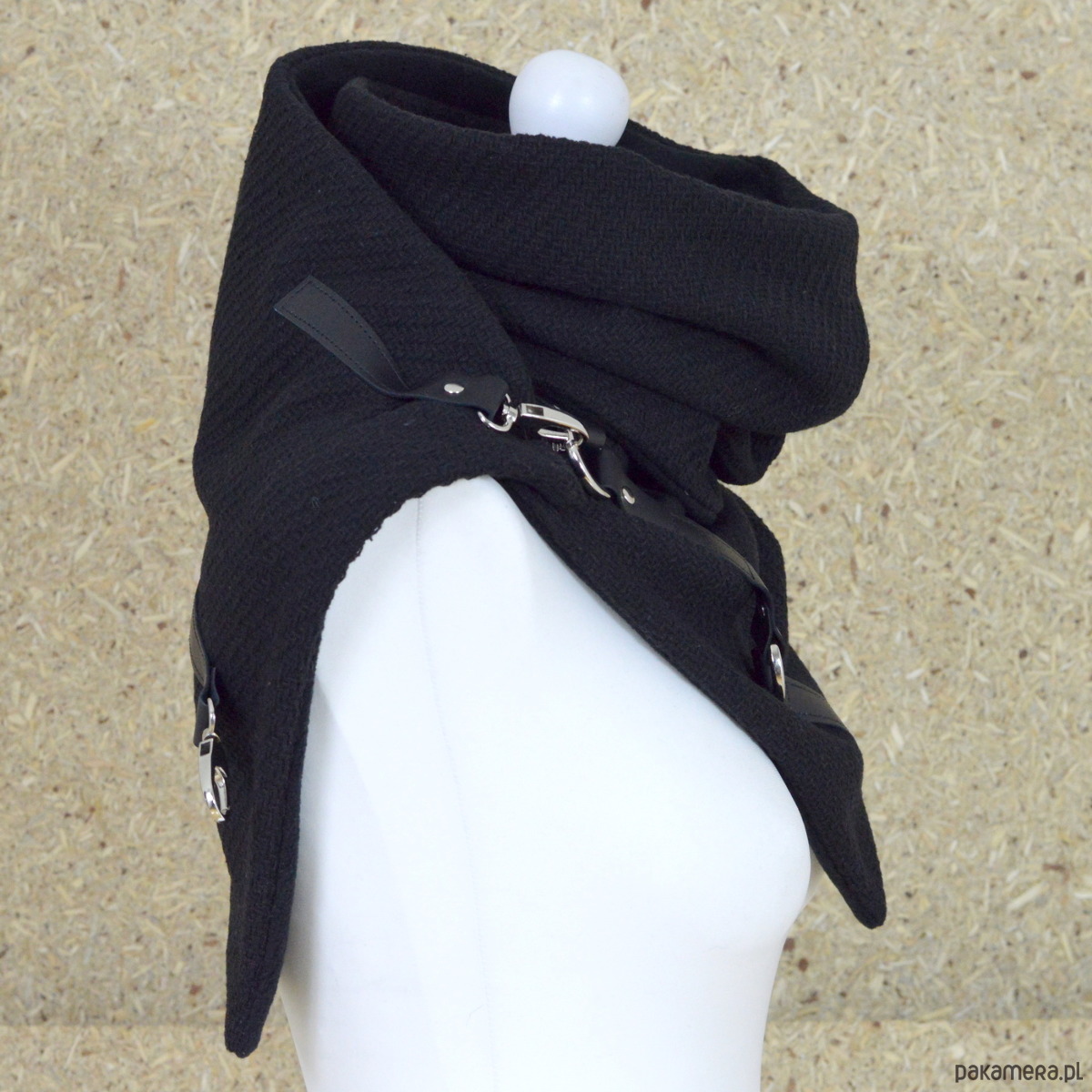 Bardzo starannie wykonany szal zapinany na 2 duże, ładne karabińczyki. Szal zostały wykonany z 2 warstw materiału - wierzchnia - czarna, gruba, włoska wełna z widocznym splotem, spód z czarnego, miłego w dotyku mikropolaru. Szal zdobiony jest naturalną skórą oraz metalowymi kółkami i zapięciami. Produkt zdecydowanie z charakterem ;)