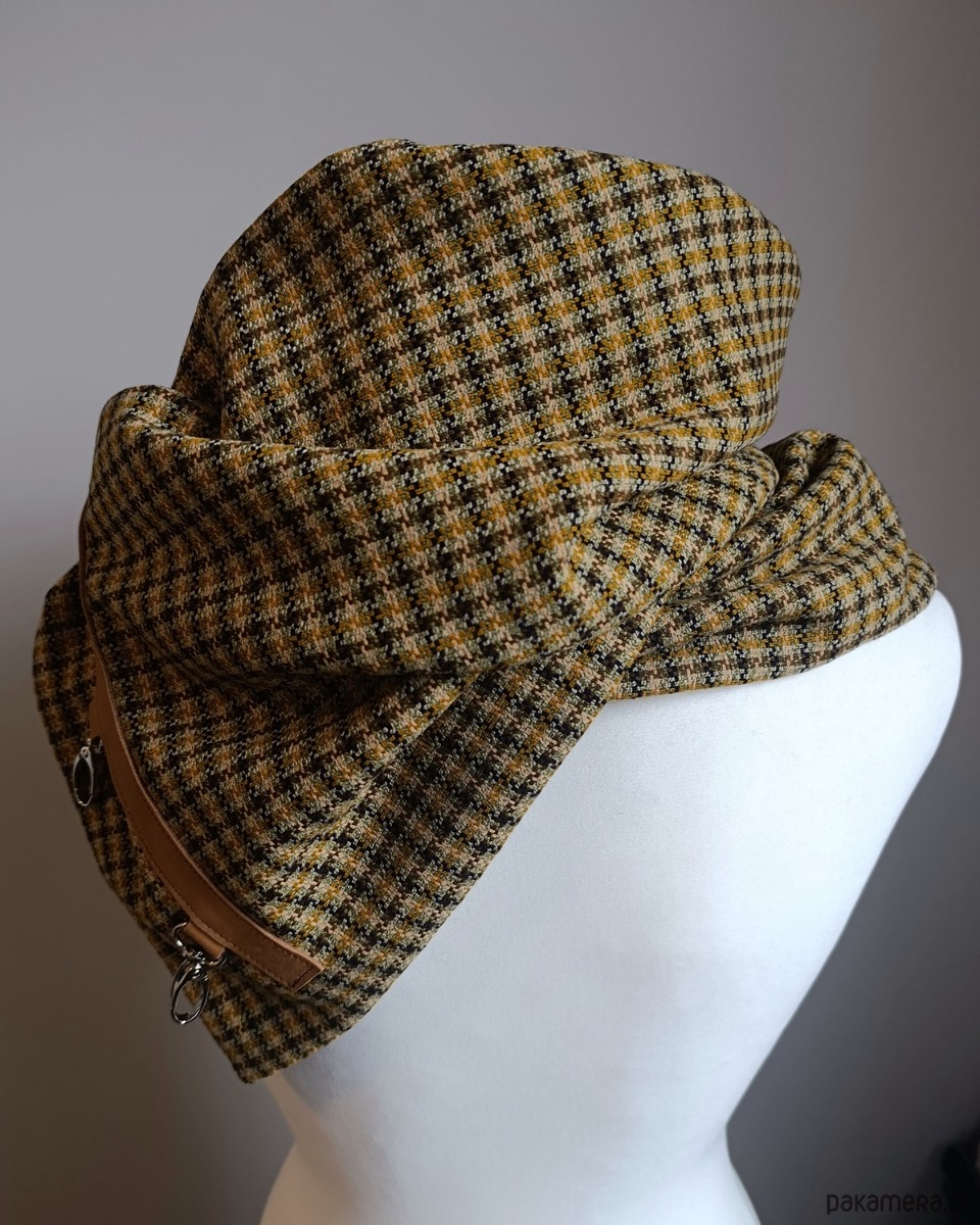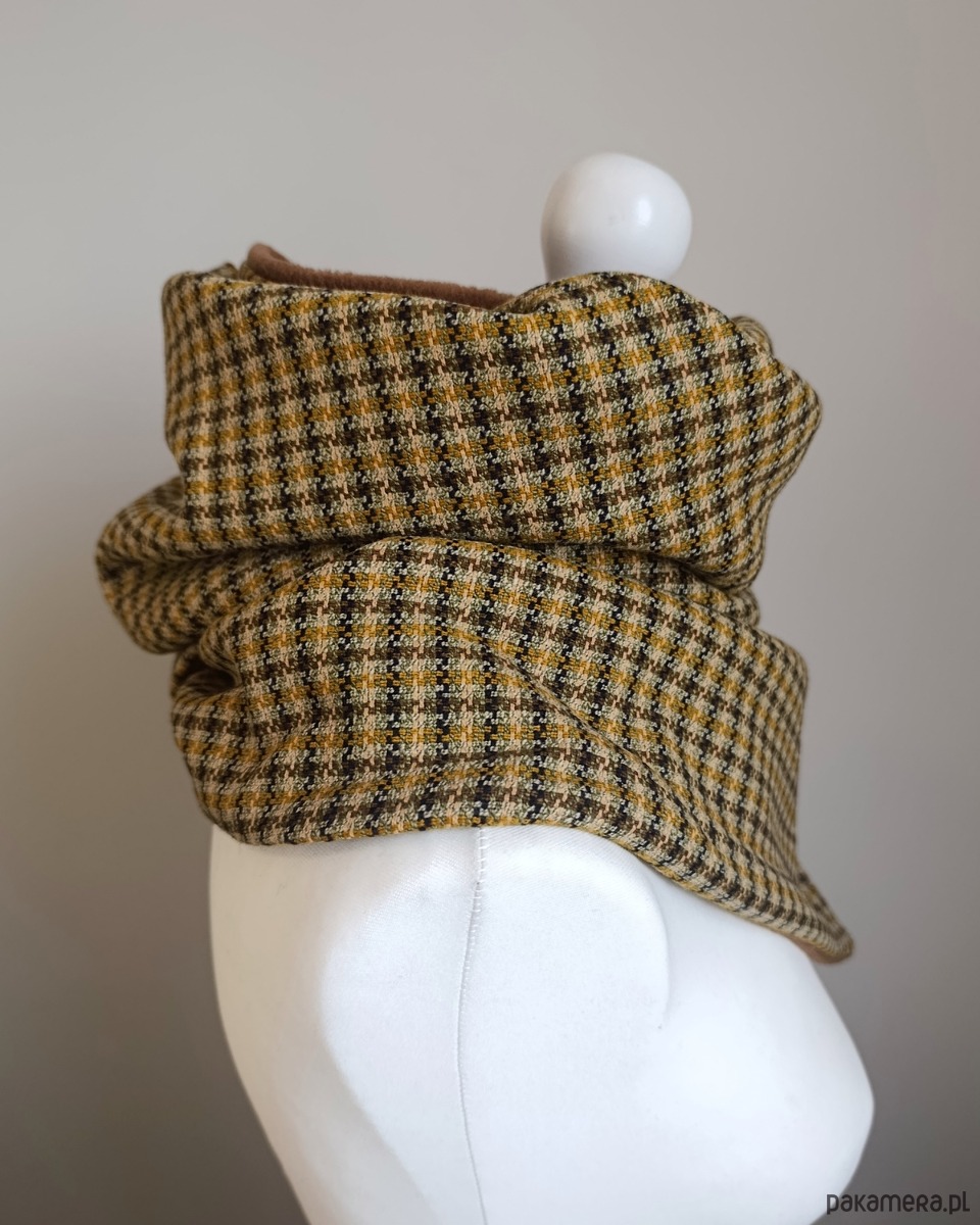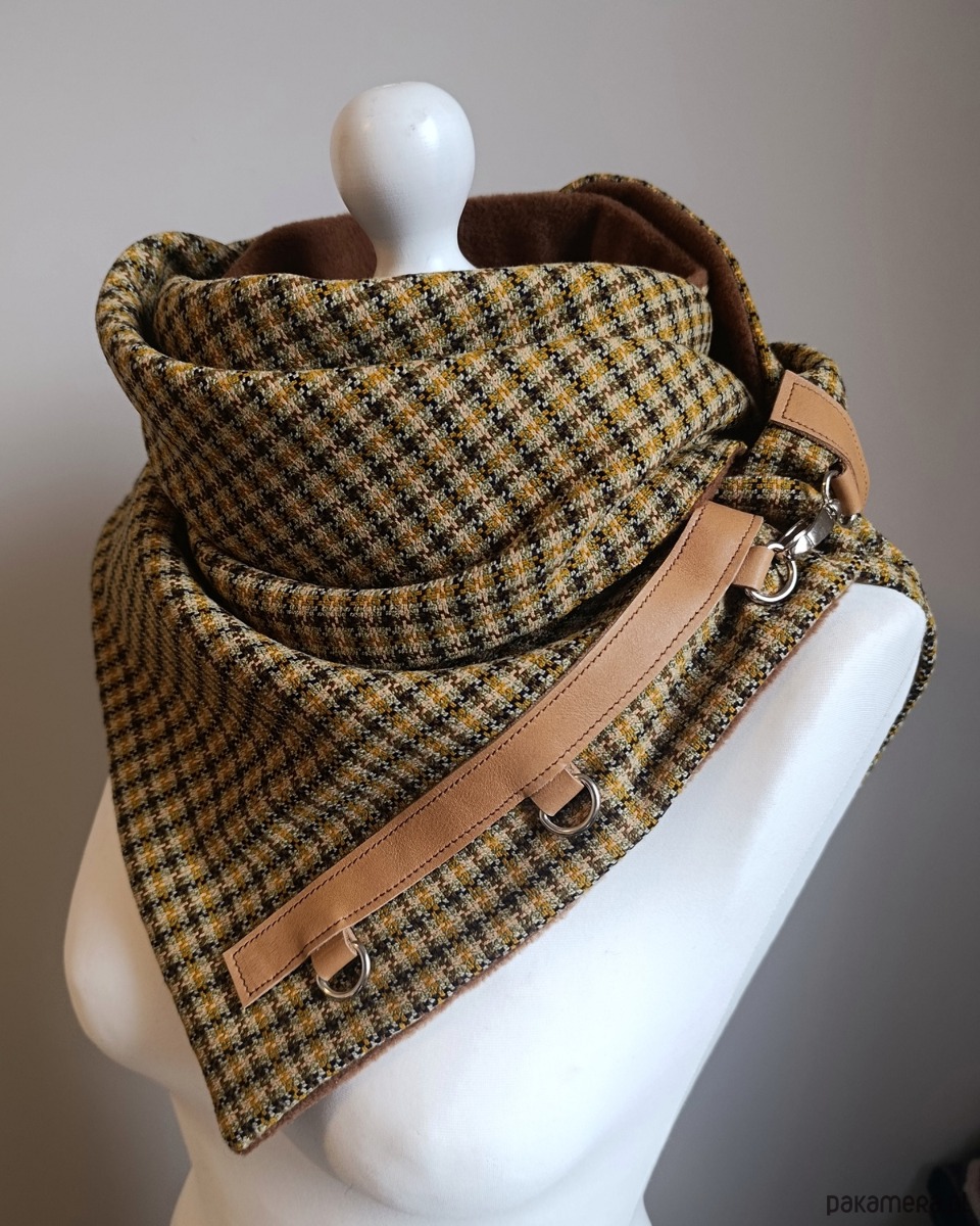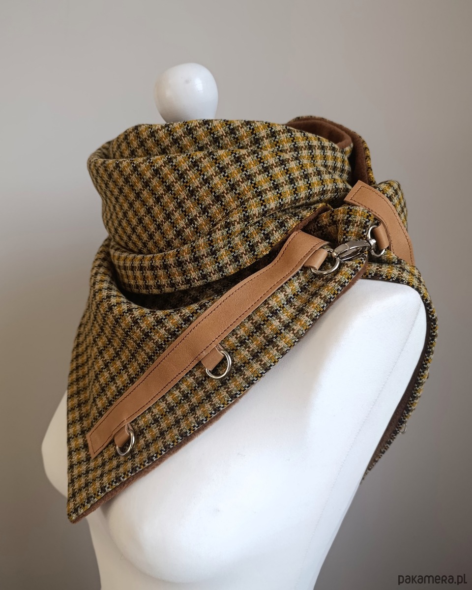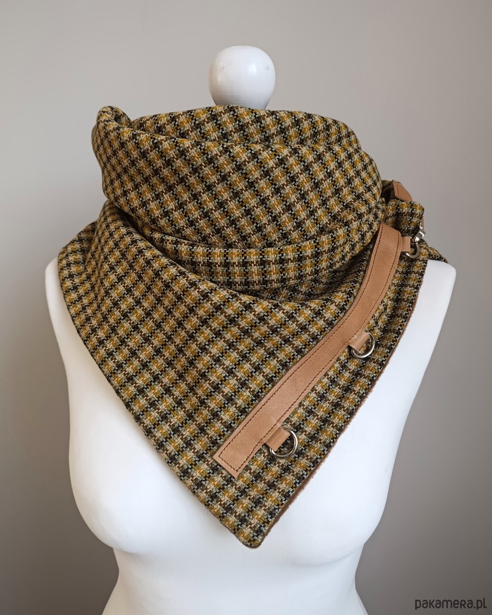 Bardzo starannie wykonany szal zapinany na 3 karabińczyki. Szal zostały wykonany z 2 warstw materiału - wierzchnia- kraciasta tkanina wełniana w kolorach: zielony, musztardowy, beżowy, brązowy. Spód z, miłego w dotyku polaru w pasującym kolorze- toffi.. Szal zdobiony jest naturalną skórą oraz metalowymi zapięciami.