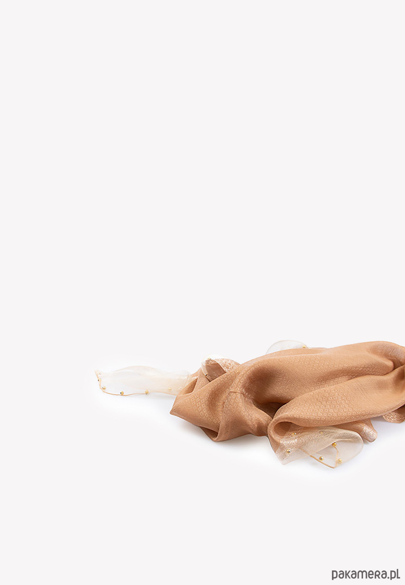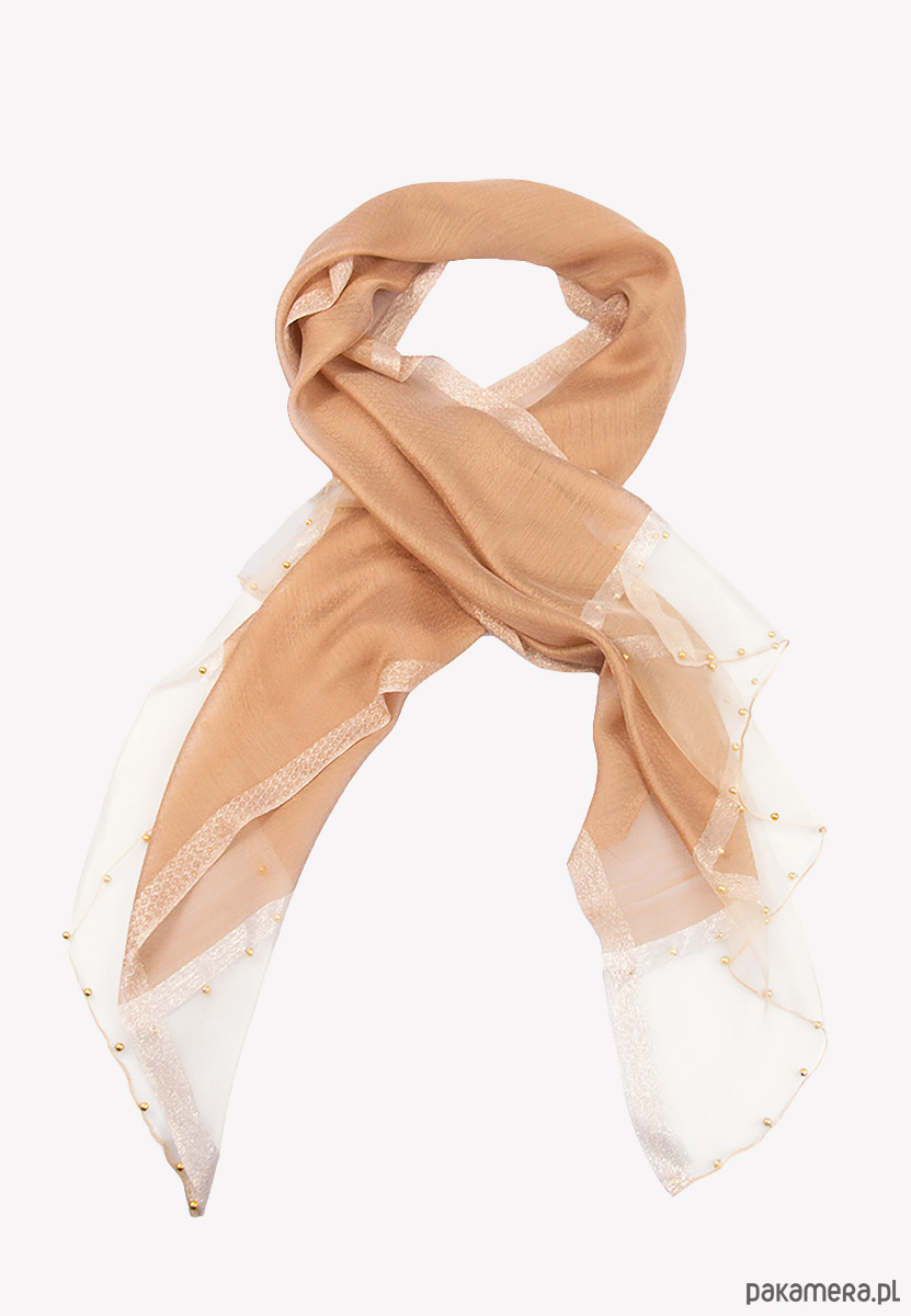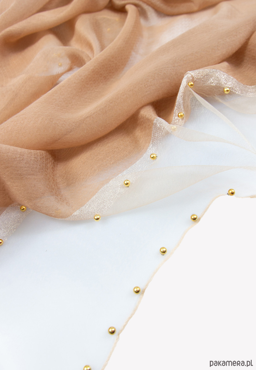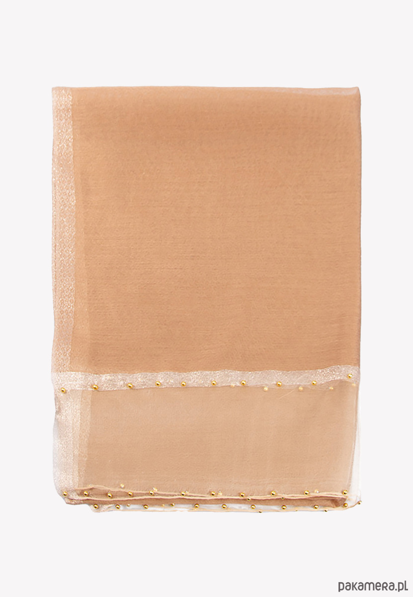 Elegancki szal w subtelnym odcieniu beżu, zdobiony delikatnymi złotymi akcentami, które podkreślają jego wyjątkowy charakter. Doskonały dodatek, łączący ponadczasową klasykę z nowoczesnym stylem. Idealny na chłodniejsze dni, dodając szyku każdej stylizacji.