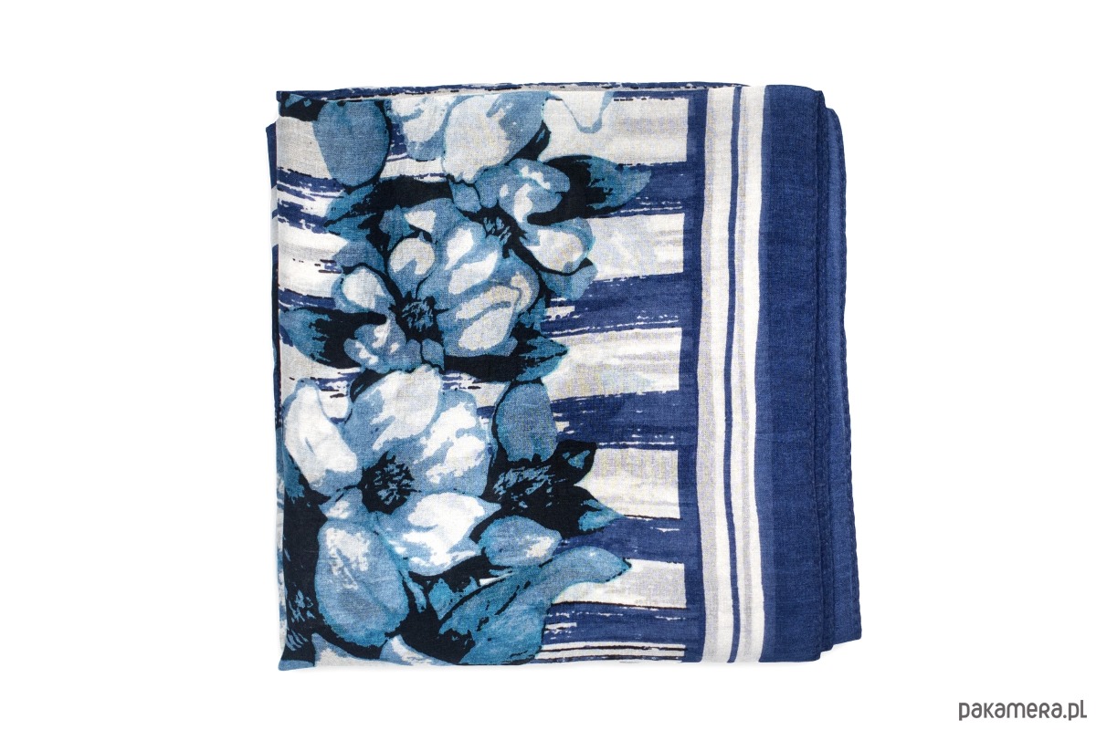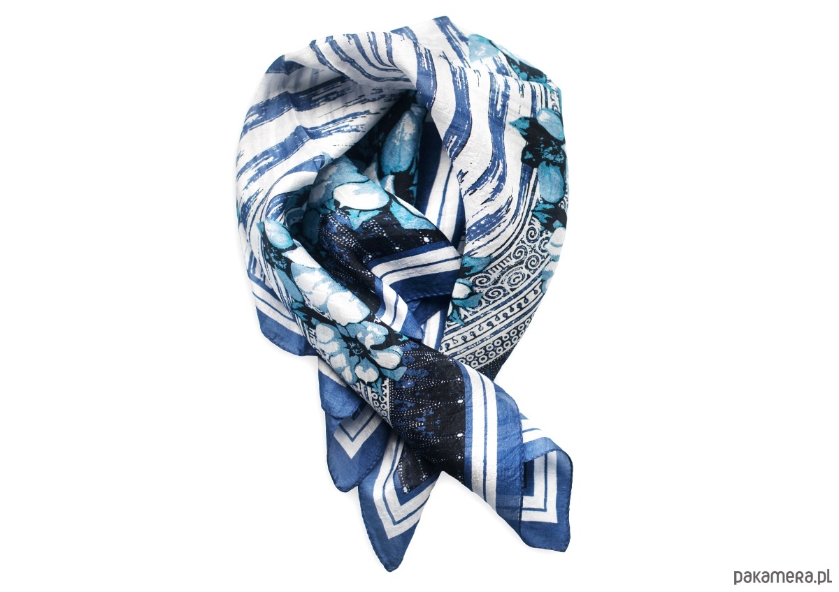 Jedwabna apaszka w odcieniach niebieskiego we wzory.