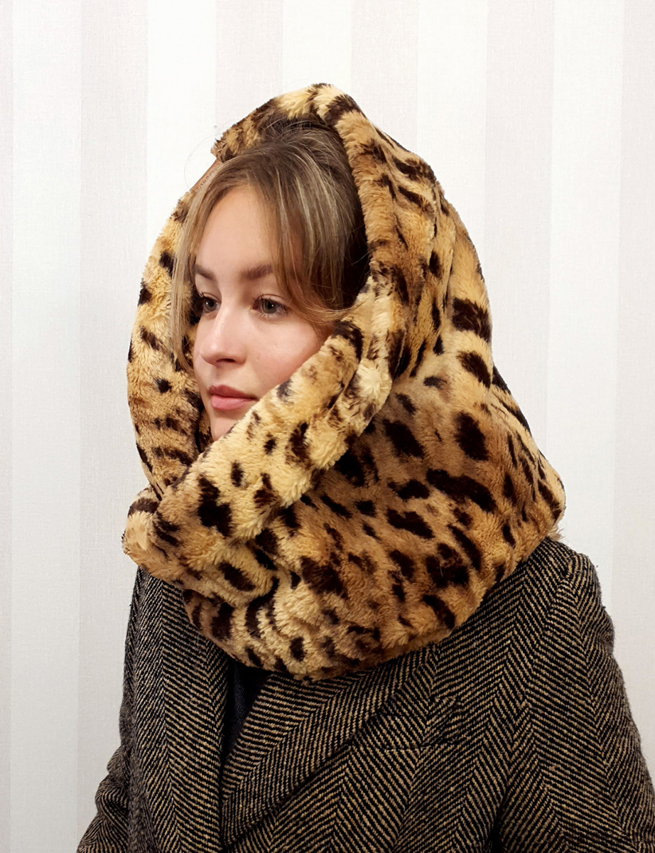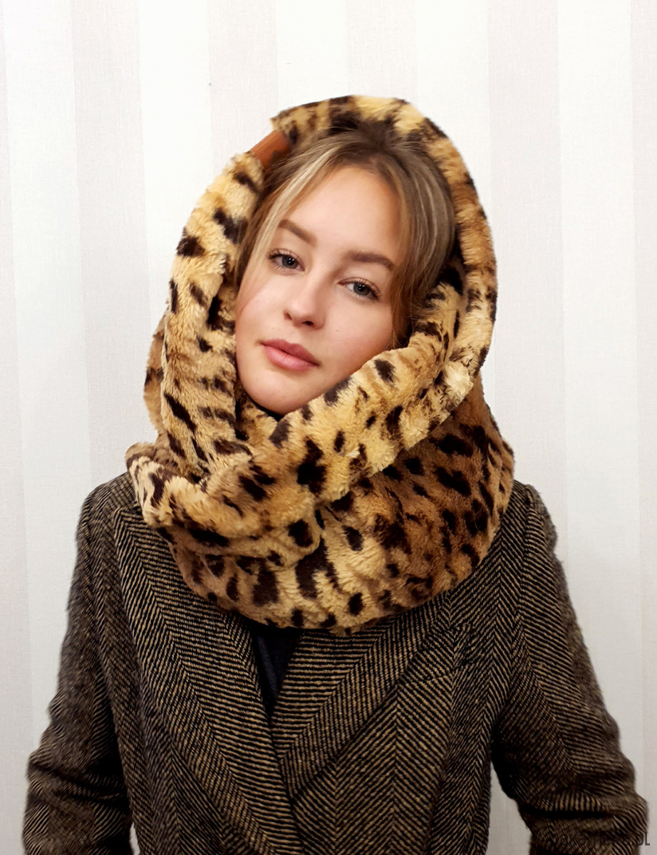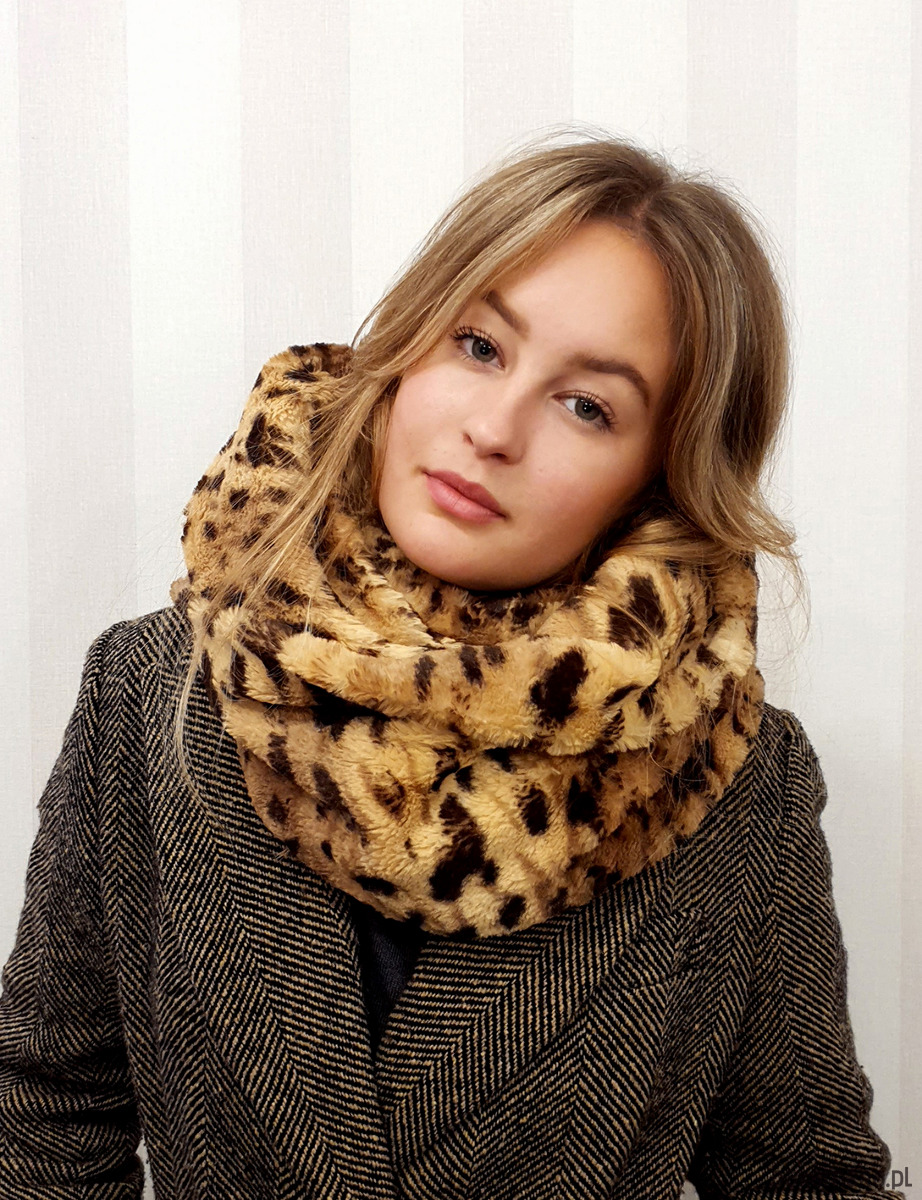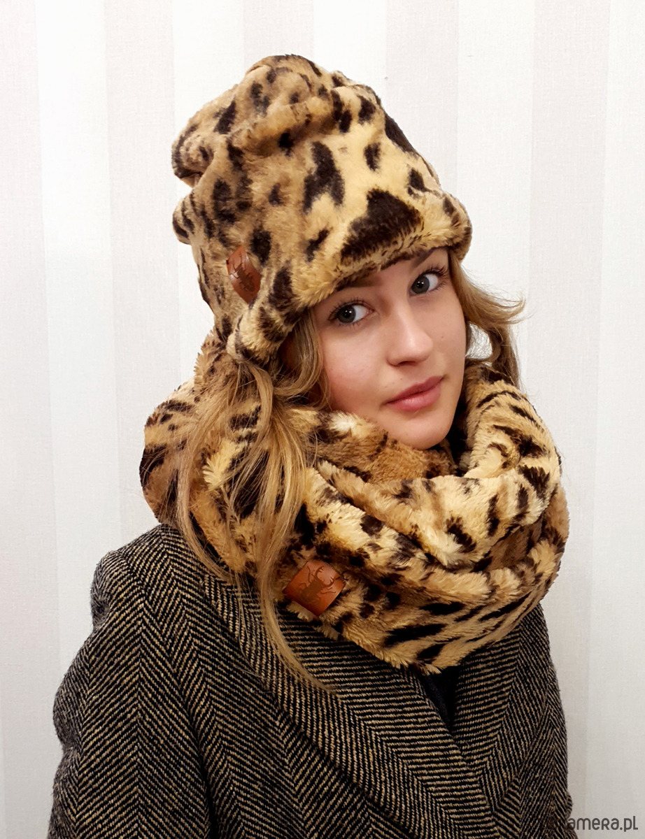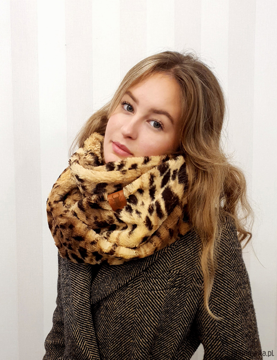Szal sztuczne futro CHAPOOSIE. Przepiękny, obfity futrzany szal, opatulacz CHAPOOSIE w formie zawijanej "ósemki". Uszyty z przemiłej w dotyku dzianiny w lamparcie cętki w odcieniach brązu. Szal jest na tyle szeroki, że pozwala na dowolne układanie i osłonę głowy. Bardzo ciepły i opatulający. Nie dusi pod szyją. Dostępny również w odcieniach szarości. Można skompletować z czapą Wild Brown Beanie. Pranie delikatne chemiczne .