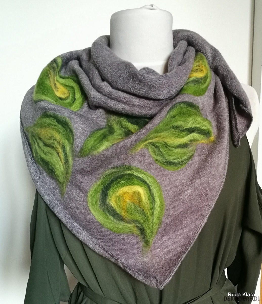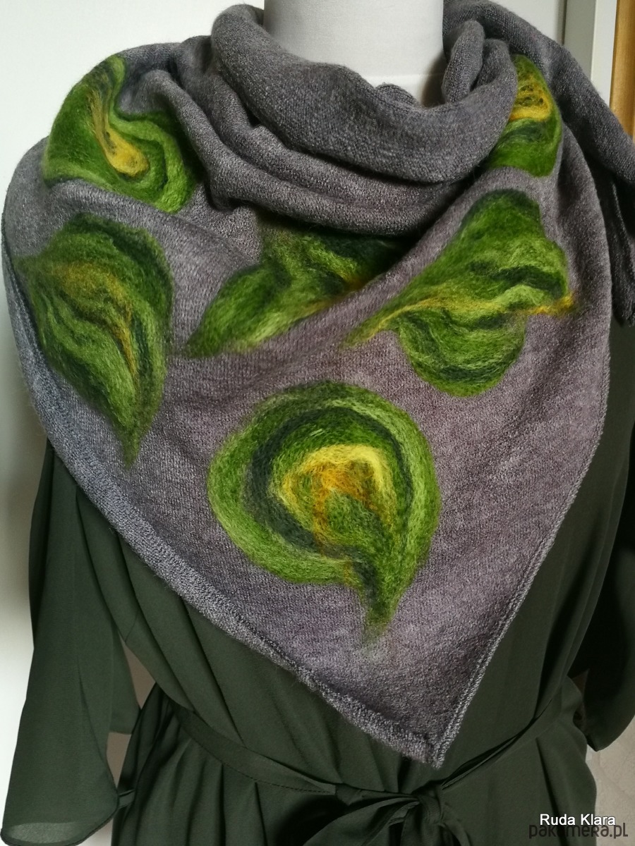 szara-bez chusta handmade wełniana , elementy filcowane to wełna merynosów, produkt wysokiej jakości , chusta miła i ciepła, doskonała na chłodne dni, idealna na prezent, wspaniała na codzienne noszenie, zwraca uwagę swą oryginalnością, miękko układa się wokół szyi, absolutny bestseller polecam Ruda KLara bez /szary czas oczekiwania 1,5 tyg