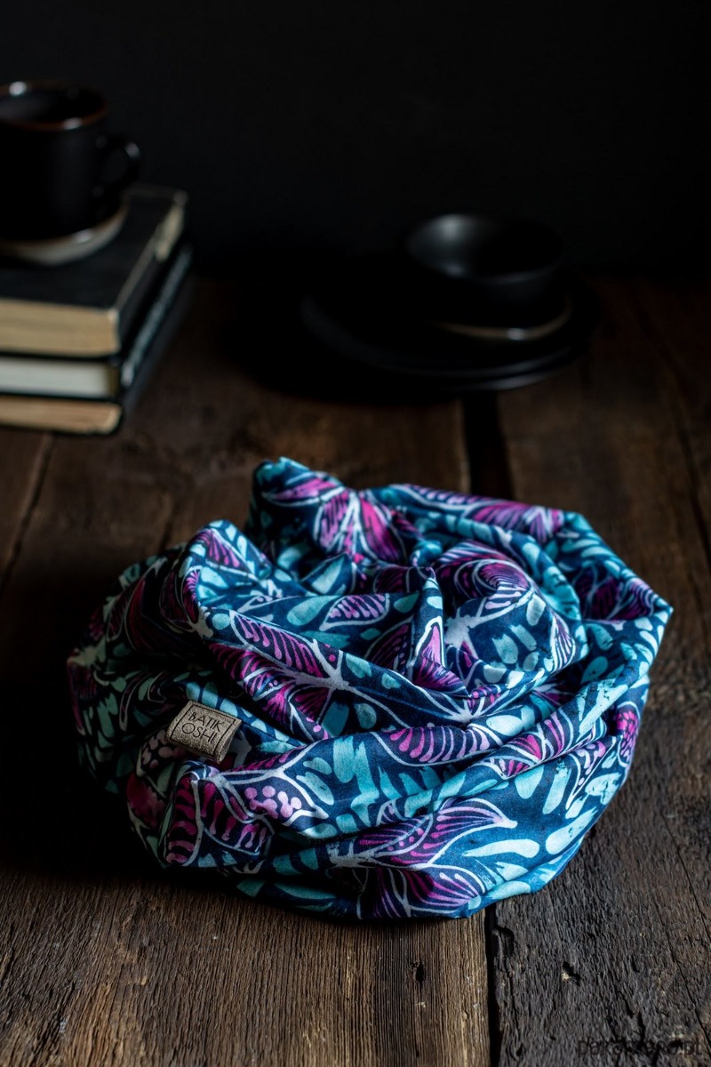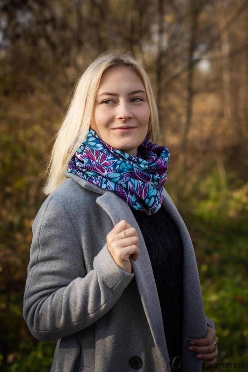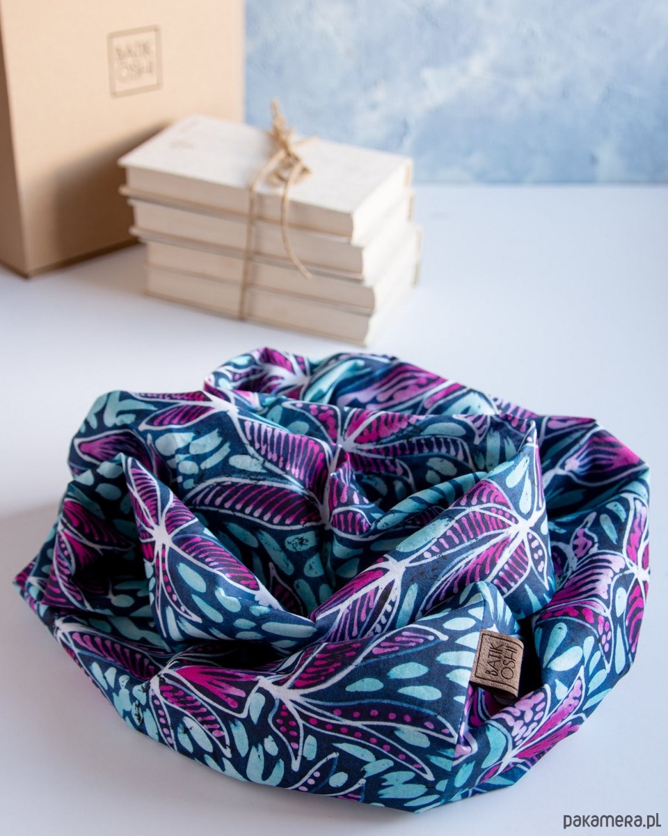 Batikowy komin w kolorach granatowym, niebieskim i różowym tworzący wzór kwiatów i liści.