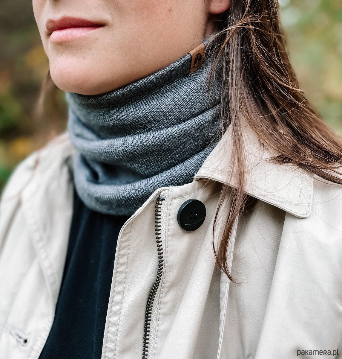 Wygodny, ciepły i wielofunkcyjny. Zakładany przez głowę, dzięki czemu nie plącze się i nie rozwiązuje jak tradycyjny szalik. Delikatnie otula szyję. Możesz regulować jego wysokość poprzez stopień wywinięcia.