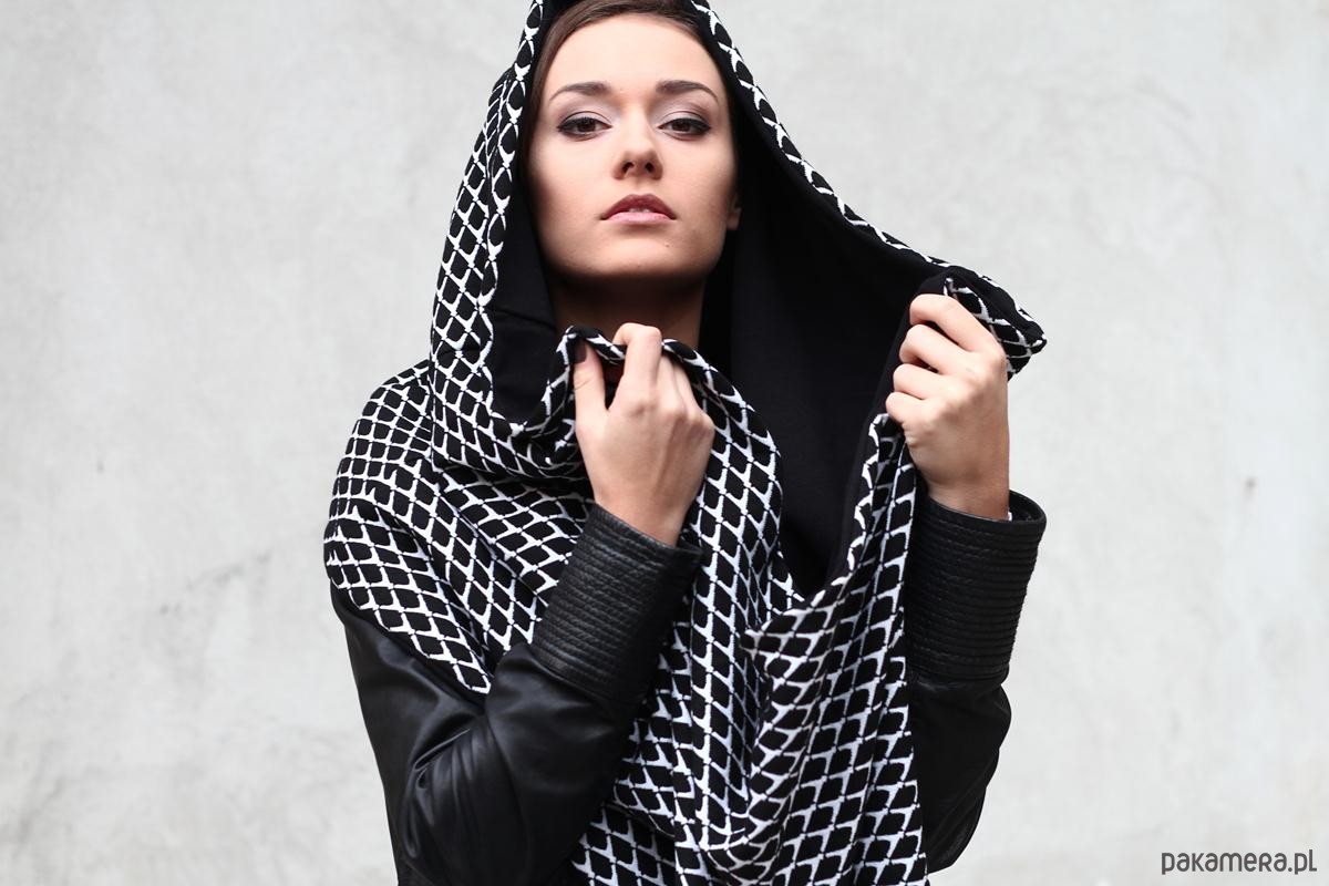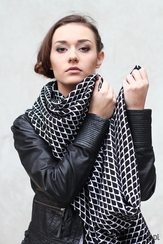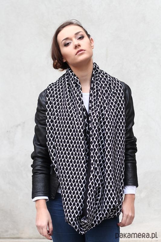 Komin owijany na szyję na dwa razy, dwustronny - jedna połówka to czarna dresówka, druga - mięsista dzianina utkana we wzór łusek. Komin jest masywny, przyjemny w dotyku i baaardzo ciepły, łatwo układa się na szyi. Jego długość pozwala na to, żeby używać go jako nakrycie głowy, narzutę na ramiona, szalik. Szerokość komina 48 cm. Długość (obwód) komina ok. 160 cm.