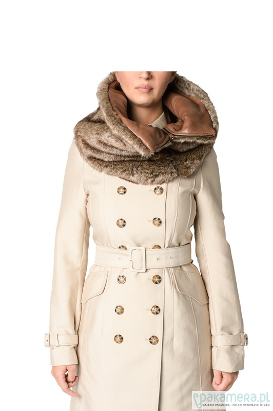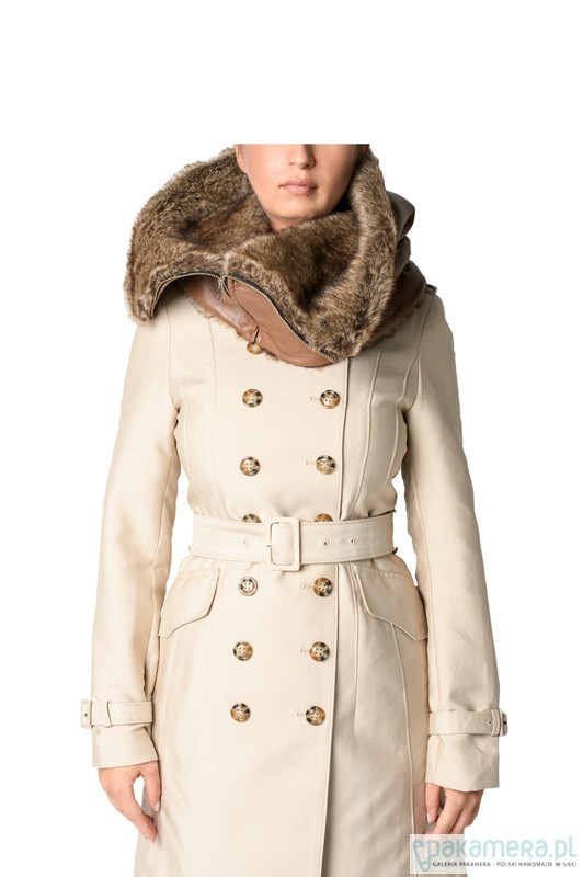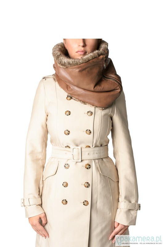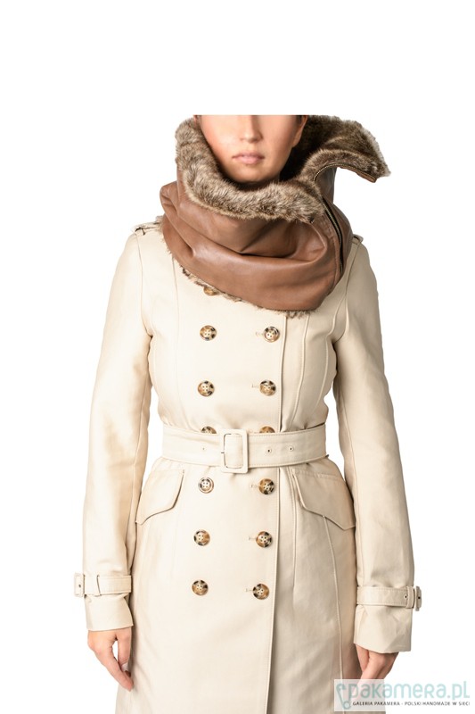 Efektowny i oryginalny komin, dwustronny zapinany na metalowy zamek. Ekskluzywny dodatek wykonany z najwyższej jakości naturalnej włoskiej skóry koloru brązowego w połączeniu z futerkiem koloru brązowego. Odpowiedni kształt szala pozwala na fantazyjne kombinacje, może służyć jako etola, komin,kołnierz, nakrycie głowy. Można go nosić na kilka sposobów zarówno zapięty jak i luźno leżący na ramionach. Pasuje zarówno na odzież wierzchnią jak i do eleganckiej kreacji. Jest miękki i miły w dotyku. Praktyczny a zarazem efektowny. Wymiary: szerokość:41 cm wysokość:30 cm