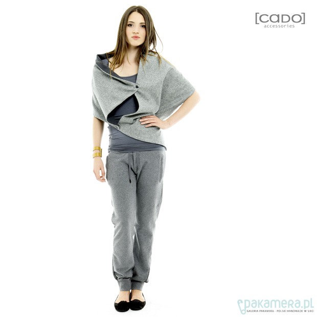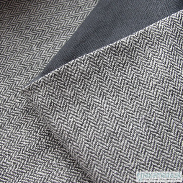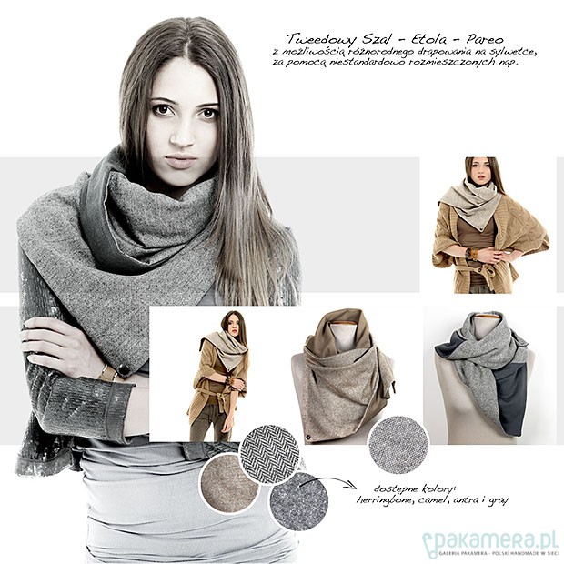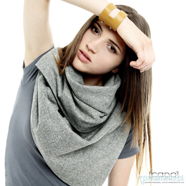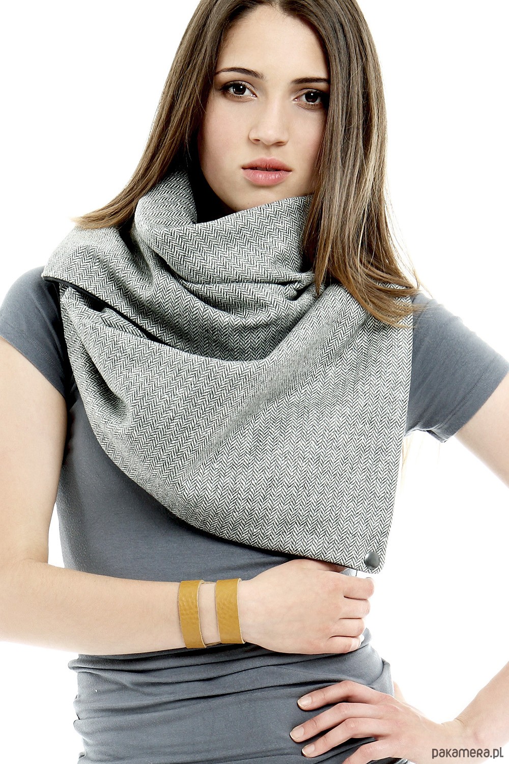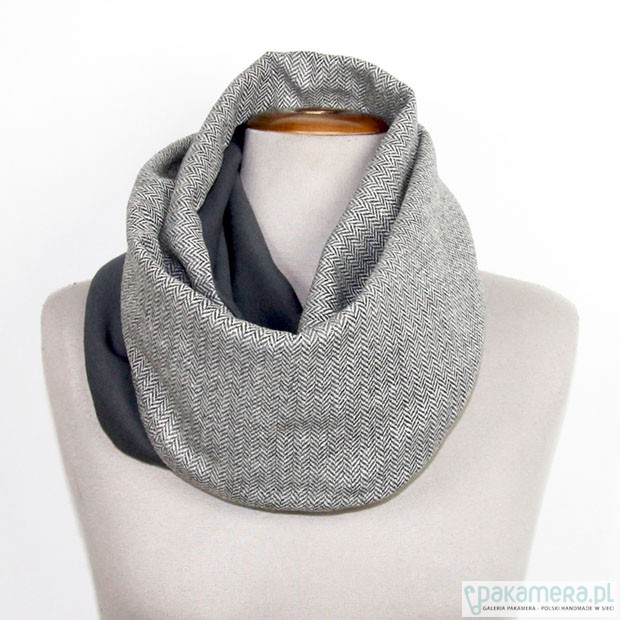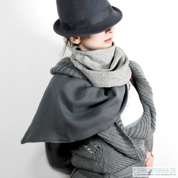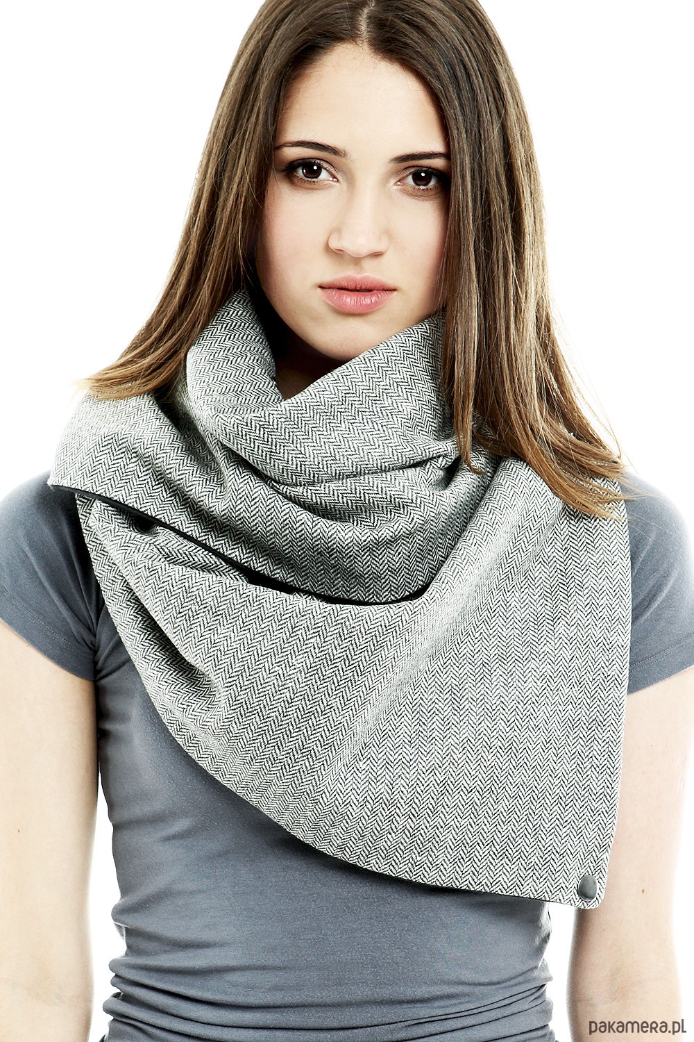 Szal, Komin, Tuba, Etola. Zapinana na niestandardowo rozmieszczone napy, co daje możliwość różnorodnego drapowania i układania na sylwetce. Można ją również nosić jak klasyczny szal. DWUSTRONNA: klasyczna szara jodełka + grafitowa dzianina dresowa. wym: długość: 150 cm, wysokość: 40 cm