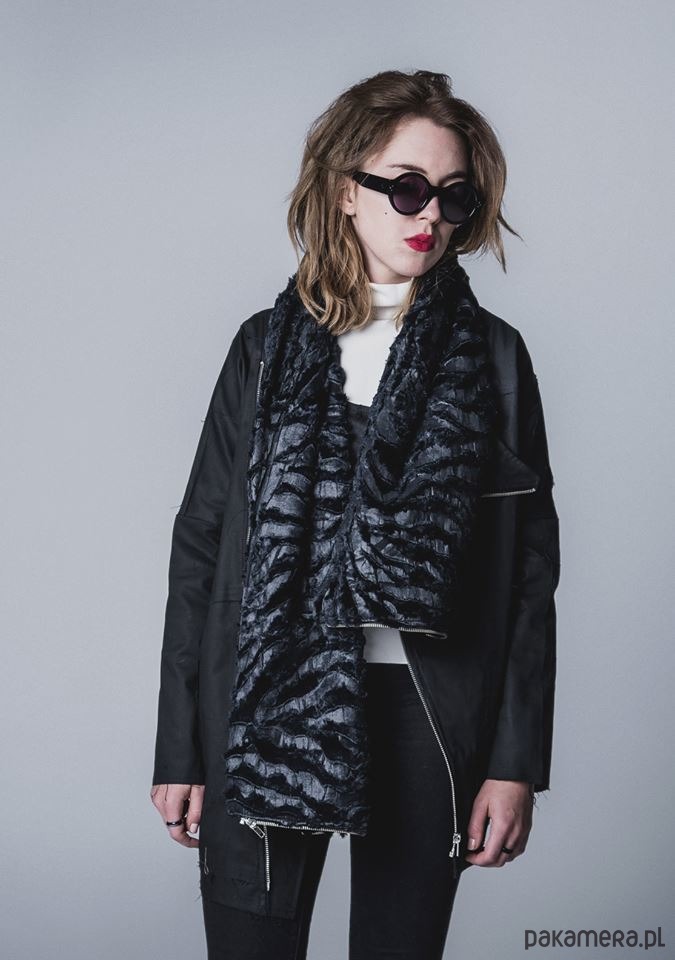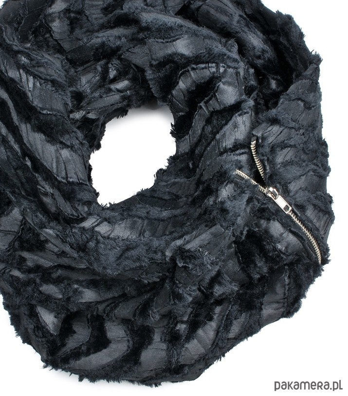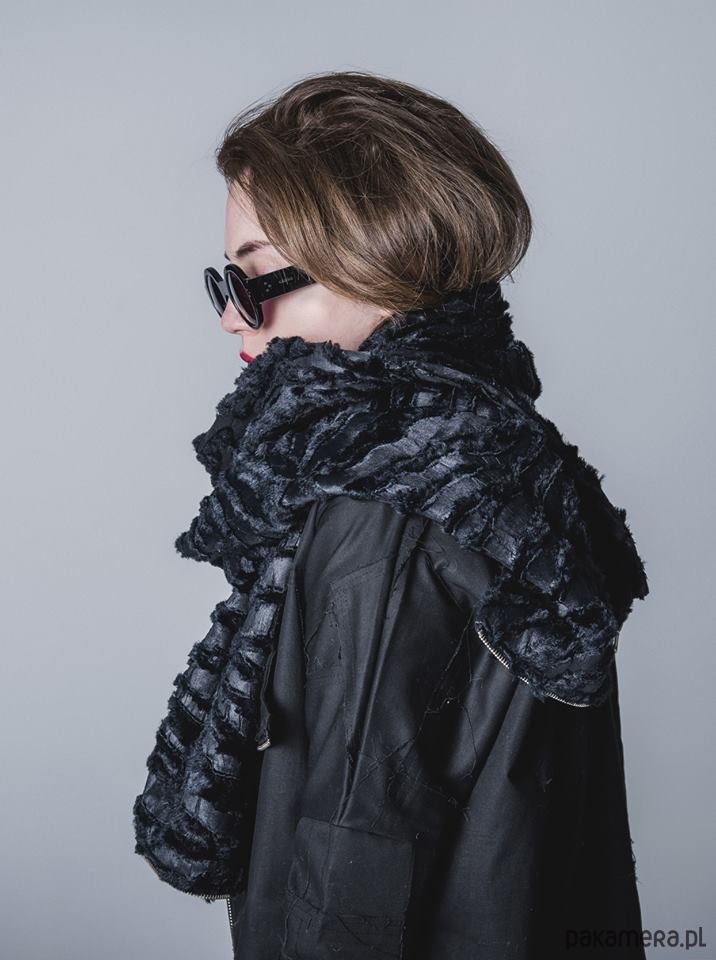 Duży, ciepły szal wykonany z futra (ekologicznego). Wnętrze z ciepłej wysokogatunkowej dzaininy, Szal zapinany jest a zamek błyskawiczny w kolorze srebra. Dzięki temu można go przeróżnie układać. Zapięty tworzy ciepły, szczelnie otulający szyję komin,rozpięty i puszczony do dołu tworzy elegancki szal. Narzucony, delikatnie rozpięty imituje nawet kołnierz kurtki lub płaszcza. Za jego pomocą można zmienić każdy, nawet najstarszy płaszcz w zupełnie nową rzecz. HIT!