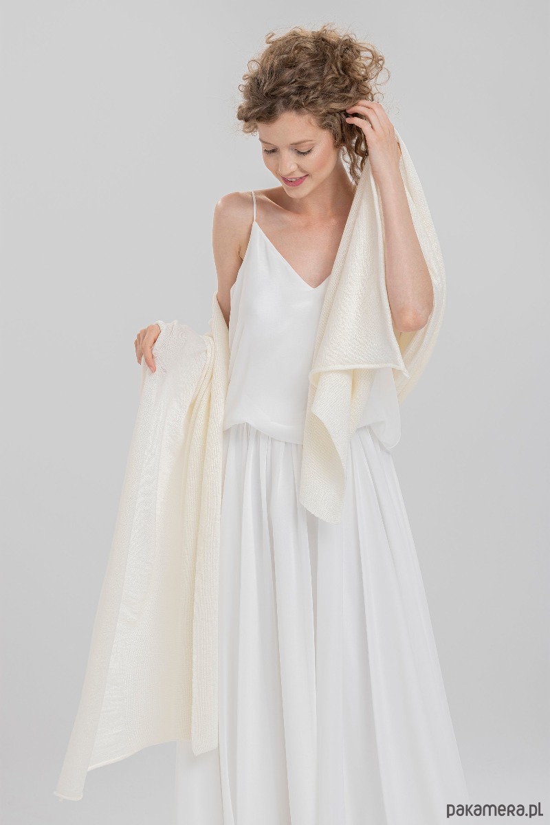 Miękki i delikatny w dotyku szal z czystej wełny merino na zdjęciu w kolorze: kość słoniowa- bardzo miły w dotyku.
