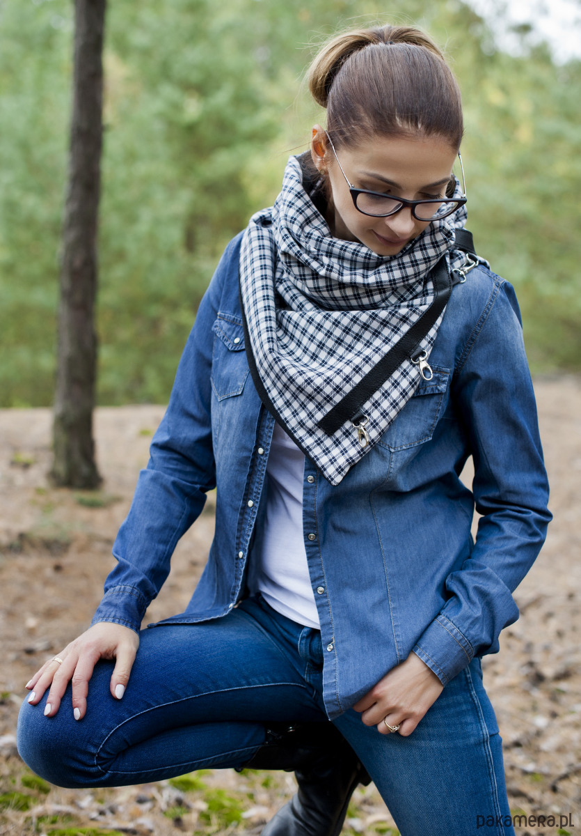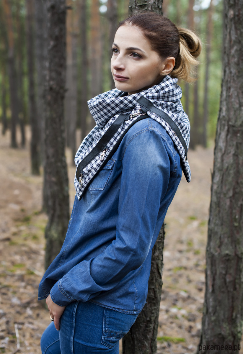 Bardzo starannie wykonany szal zapinany na 2 karabińczyki. Szal zostały wykonany z 2 warstw materiału - wierzchnia, biało-czarna tkanina w kratkę, spód z czarnego, miłego w dotyku, ciepłego lecz cienkiego mikropolaru. Szal zdobiony jest naturalną skórą oraz 3 metalowymi zapięciami.
