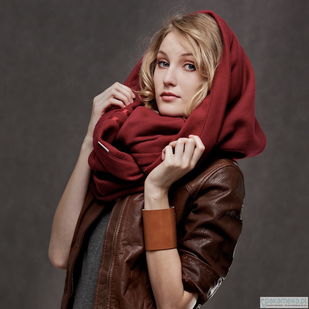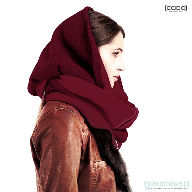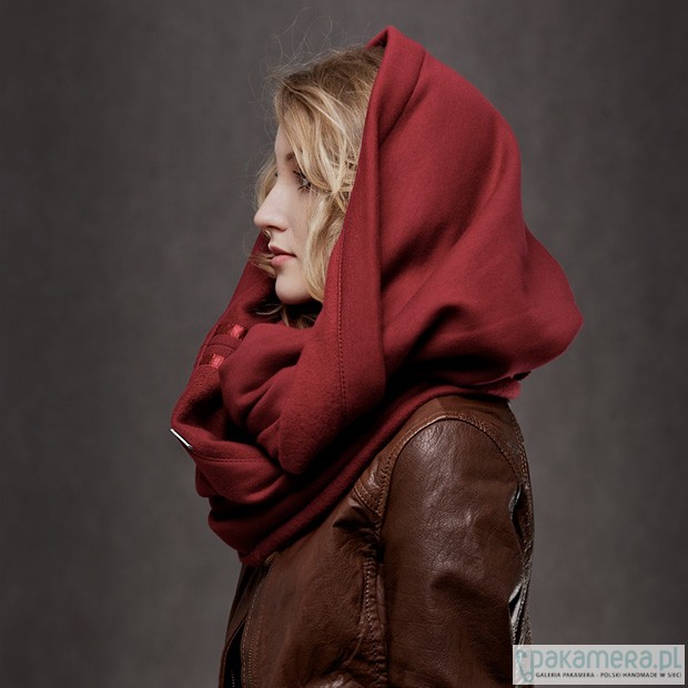 Tuba - Komin - Szal - Kapuza uszyta z grubej i miękkiej dzianiny dresowej w kolorze burgundu; Idealna na jesienne i zimowe chłody - otula, ogrzewa, pasuje do większości stylizacji; wykończenie wnętrza tzw. drapanka (cotton fleece fabric); dodatkowo ozdobny szew zaakcentowany lekko opalizującą taśmą w kol. tuby; dolna krawędź tuby - cut style (surowe wykończenie); można owijać 2krotnie wokół szyi (przylega wtedy jak klasyczny szalik) lub nosić jak kamizelkę i etolę - pojedynczo, luźno na ramionach, lub też używać zamiast czapki i kapuzy.