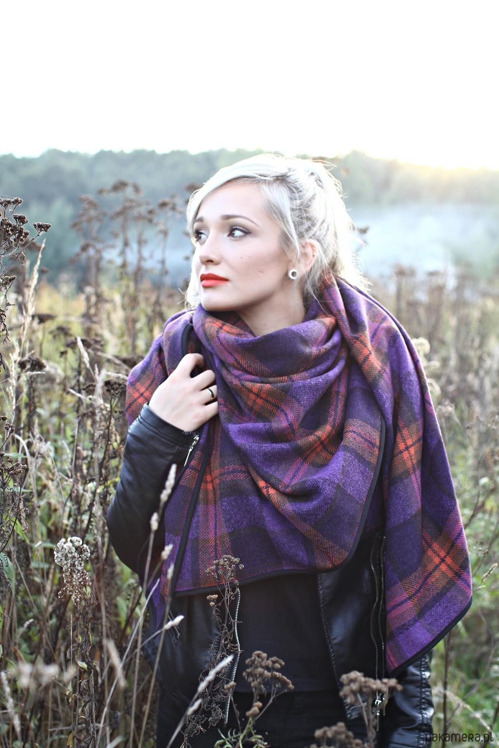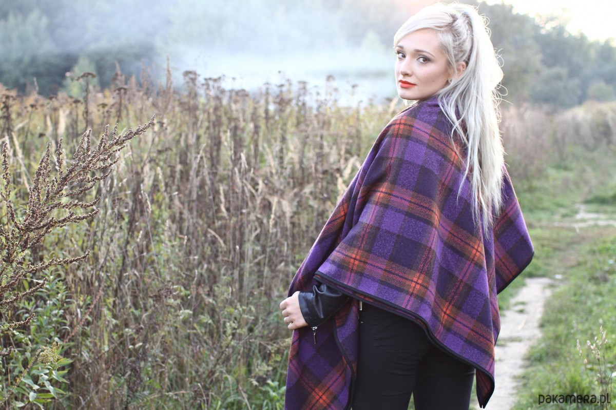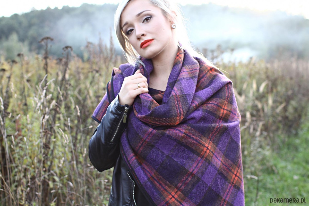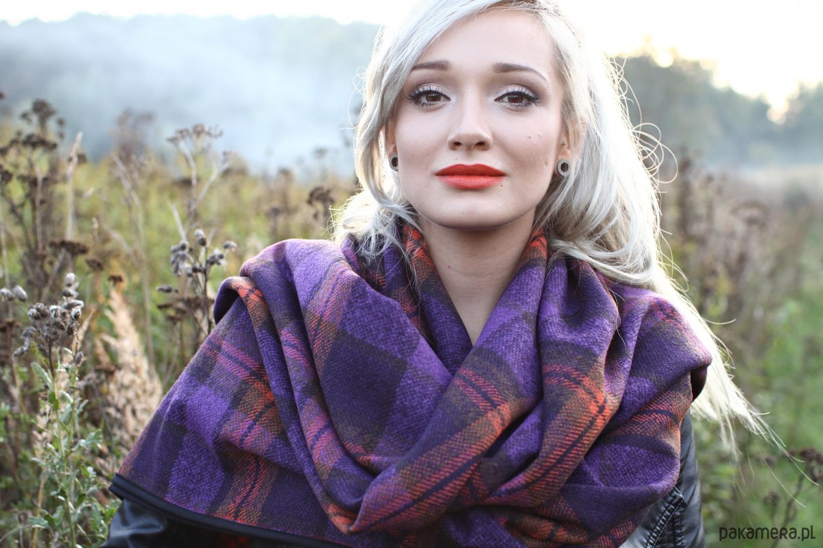 Chusta z tkaniny wełnianej z domieszką poliestru w pomarańczowo-fioletowo-czarną kratę w różnych odcieniach.
