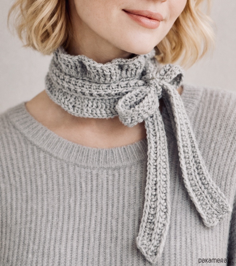 Delikatny splot i dekoracyjna kokarda która może być wiązana z przodu lub z boku nadają mu subtelny, kobiecy charakter.