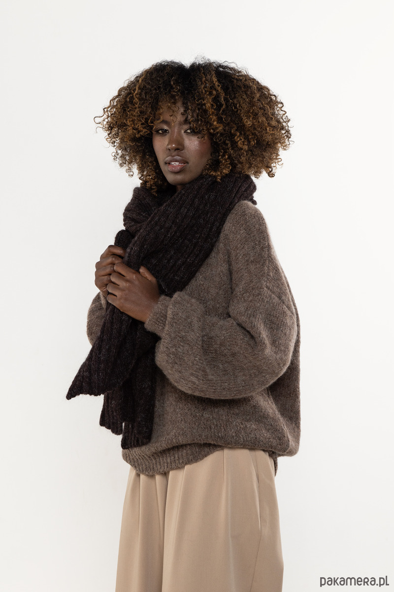 Utkany w Polsce z puszystej mieszanki, lekki, a jednocześnie wyjątkowo ciepły. Miękki w dotyku, o sprężystej, prążkowanej fakturze, która dobrze układa się przy szyi i pod płaszczem.