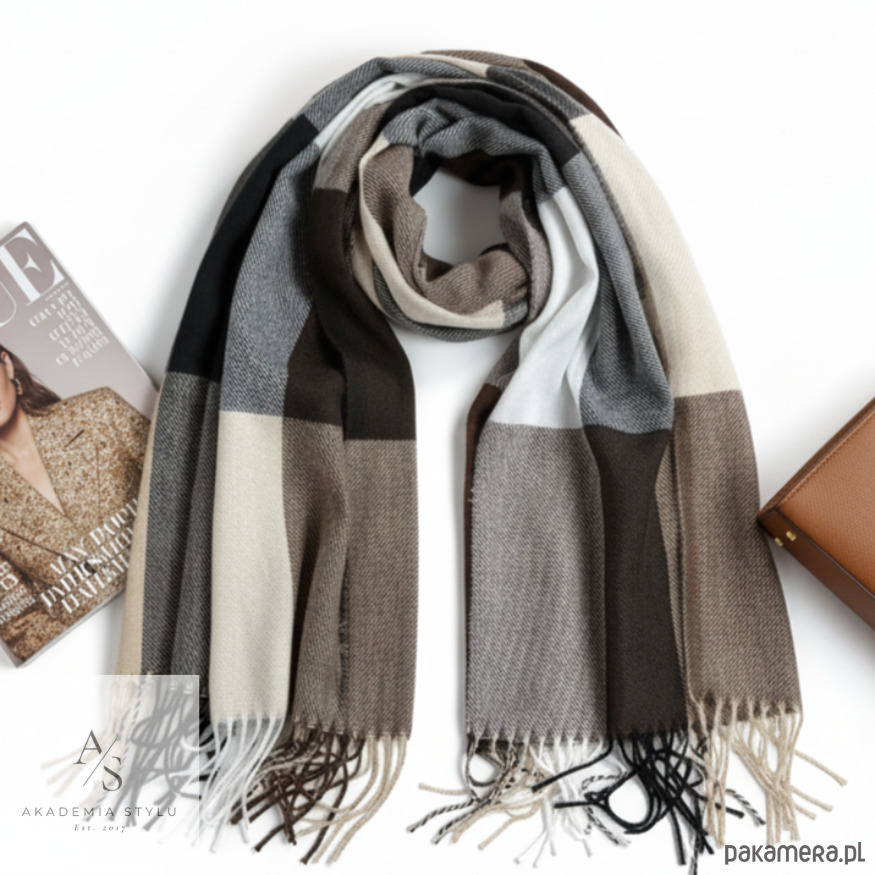 Szalik Damski kaszmirowy w kratkę brązowy beżowy kolorowy szal prezent
