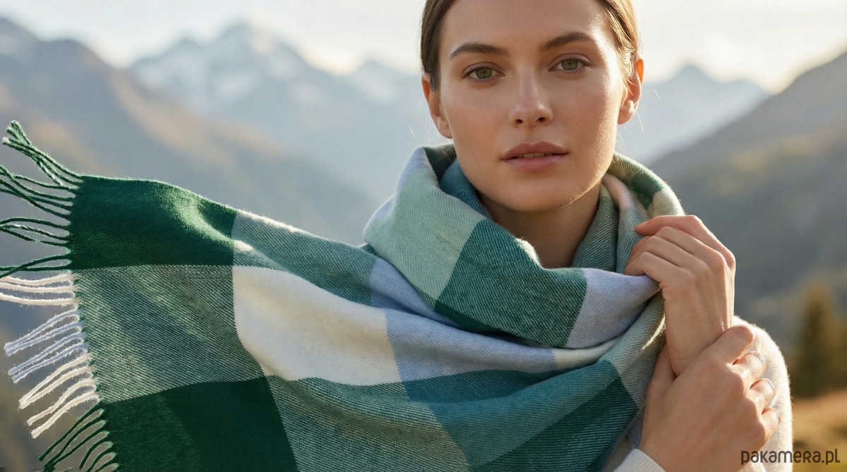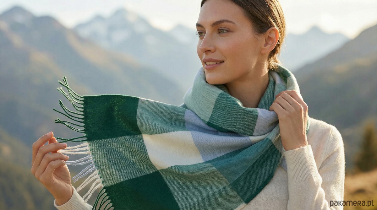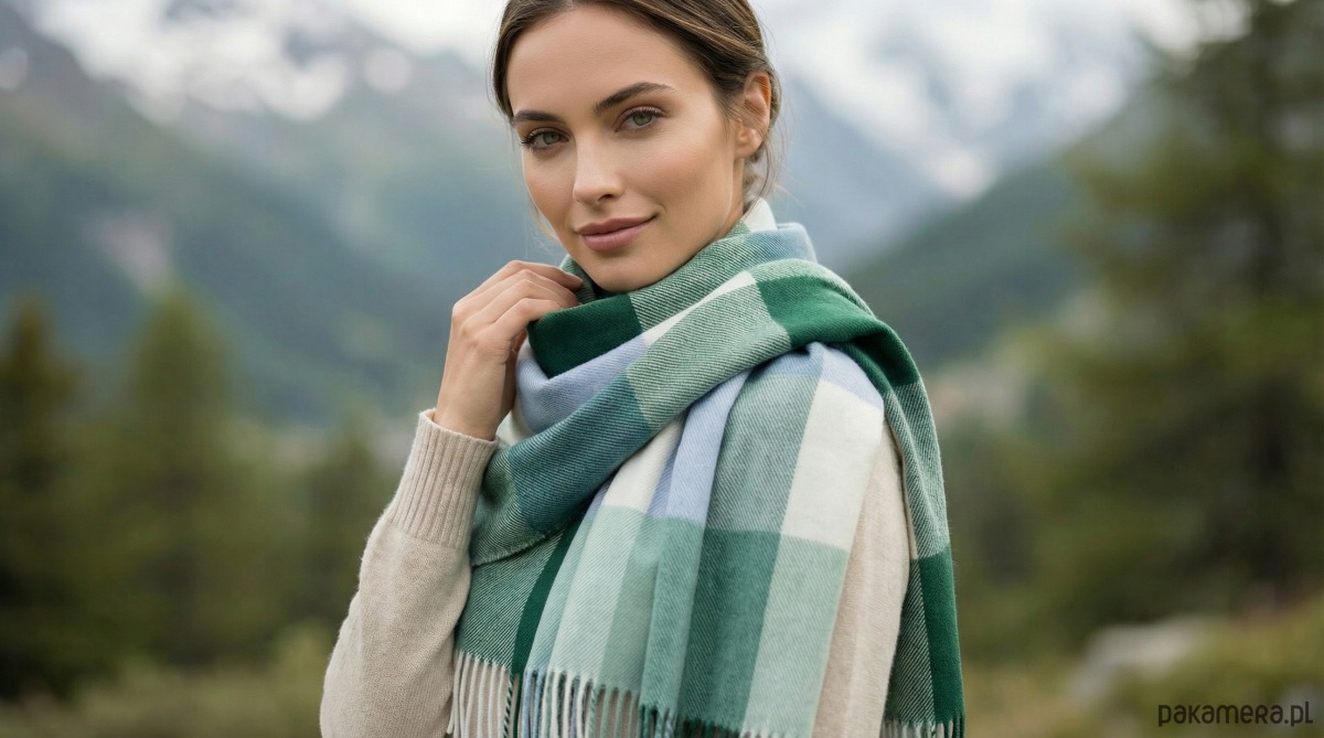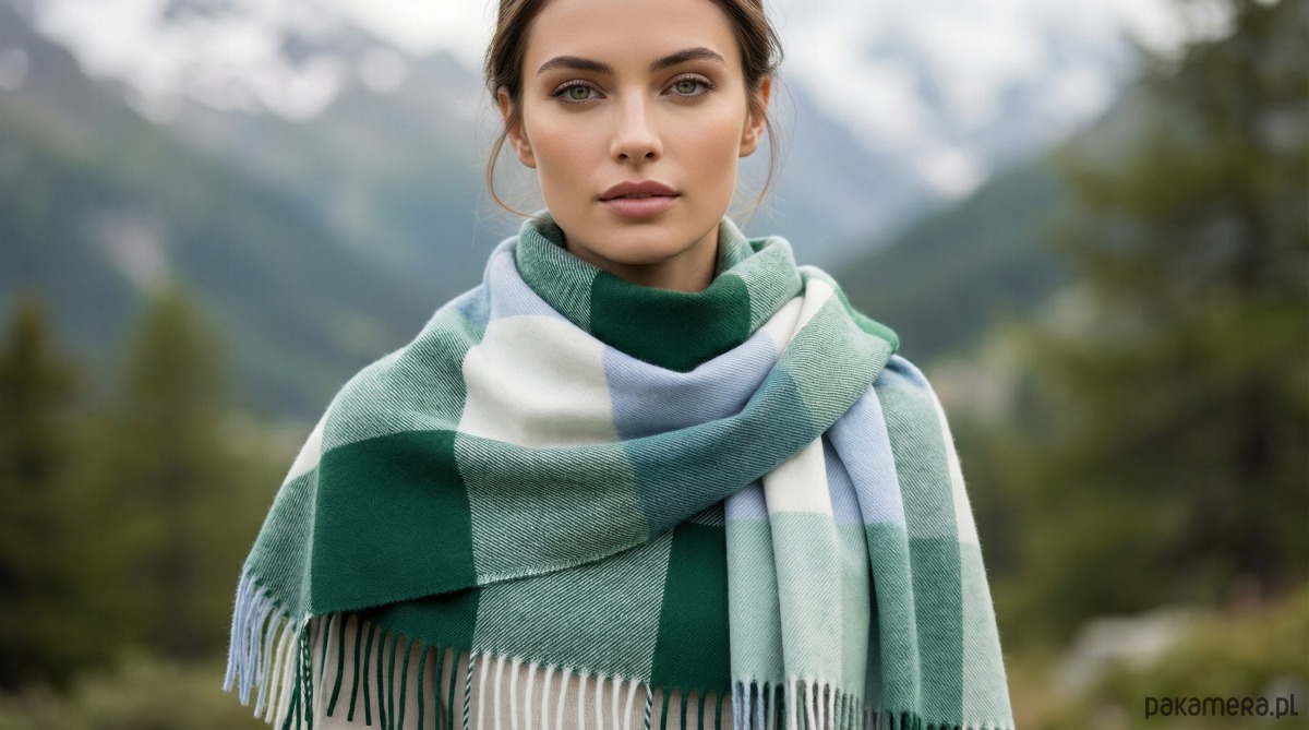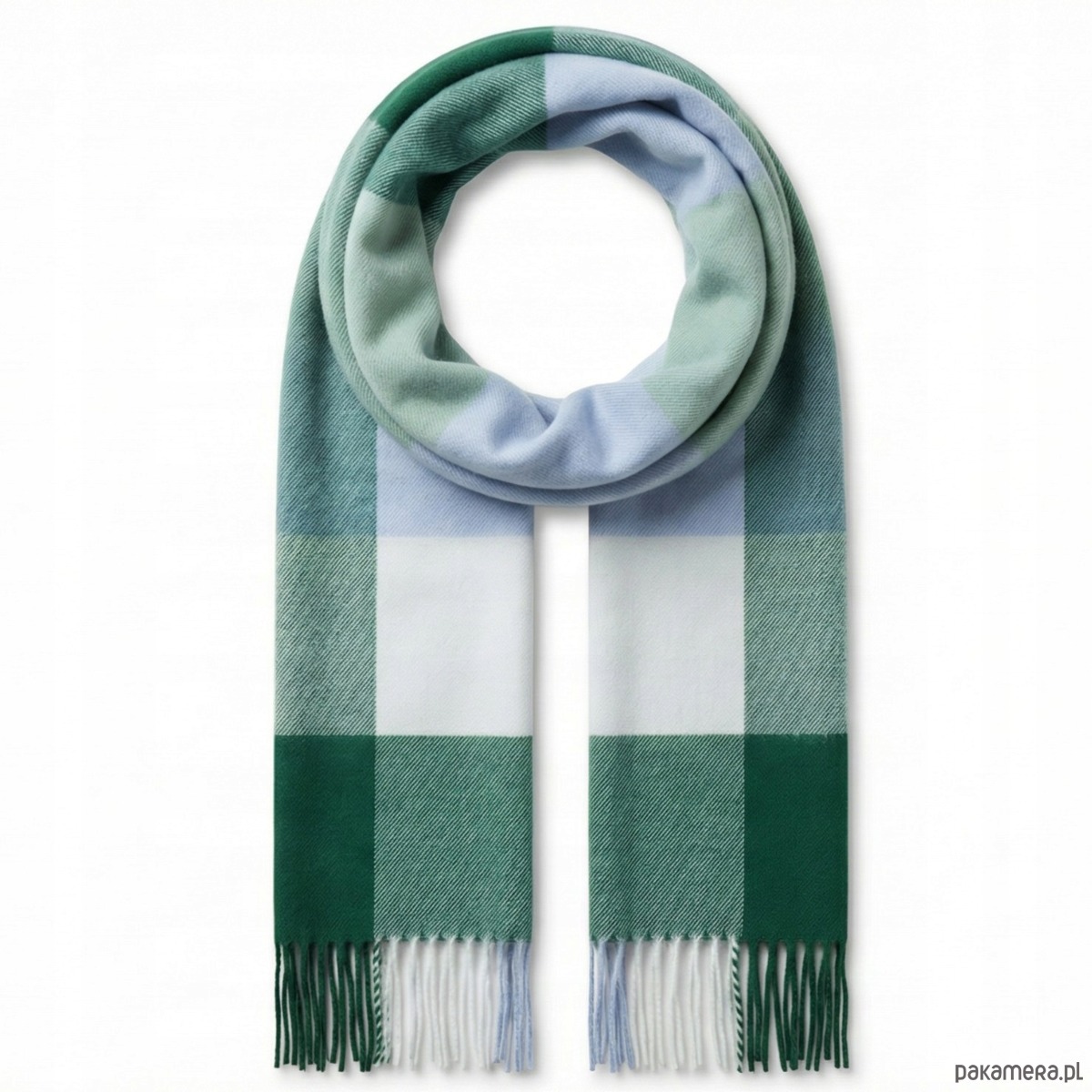 Szalik Damski kaszmirowy w kratkę zielony niebieski kolorowy szal prezent