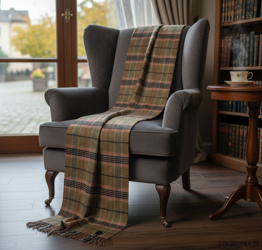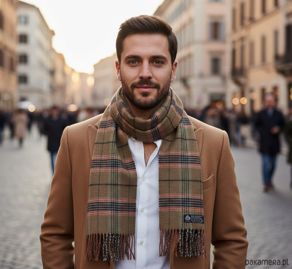 Szalik Męski Brązowy Zielony Kratka Wełna