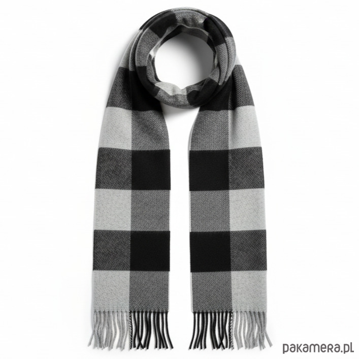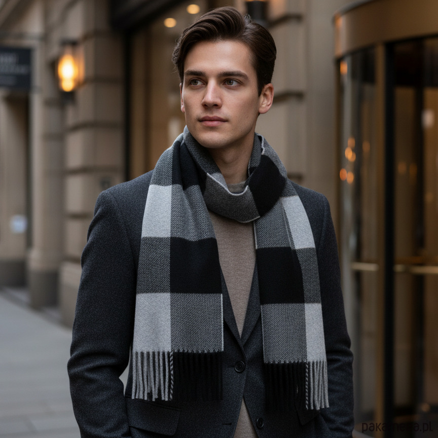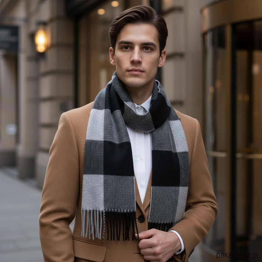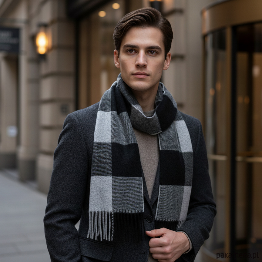 Szalik Męski czarny szal kaszmirowy w kratkę premium Akademia Stylu Czarny