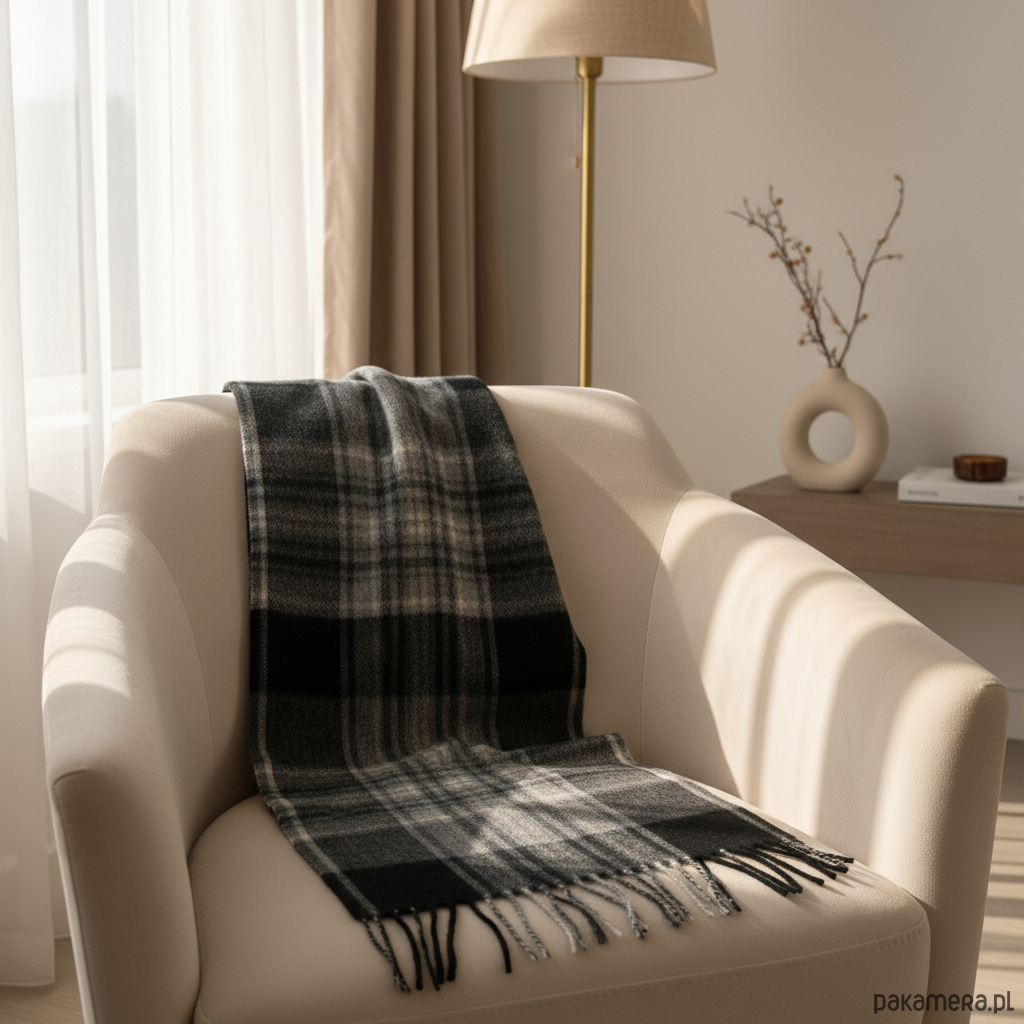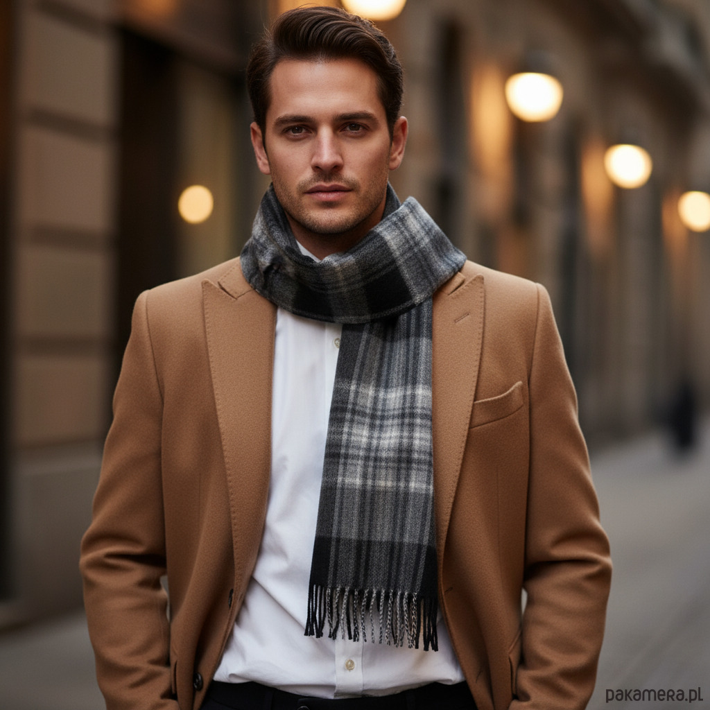 Szalik Męski Czarny Szary Kratka Wełna Kaszmir