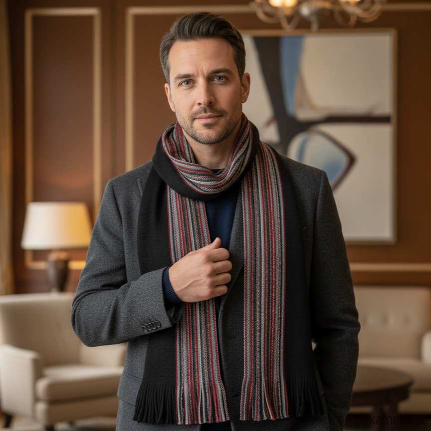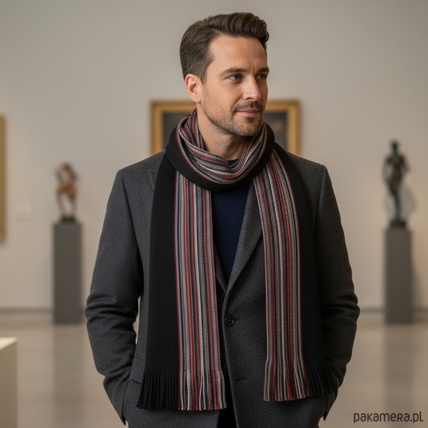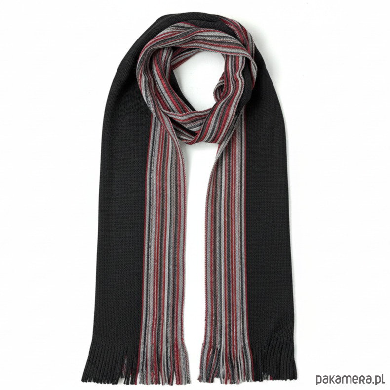 Szalik Męski szal 100% Wełniany czarny czerwony w paski