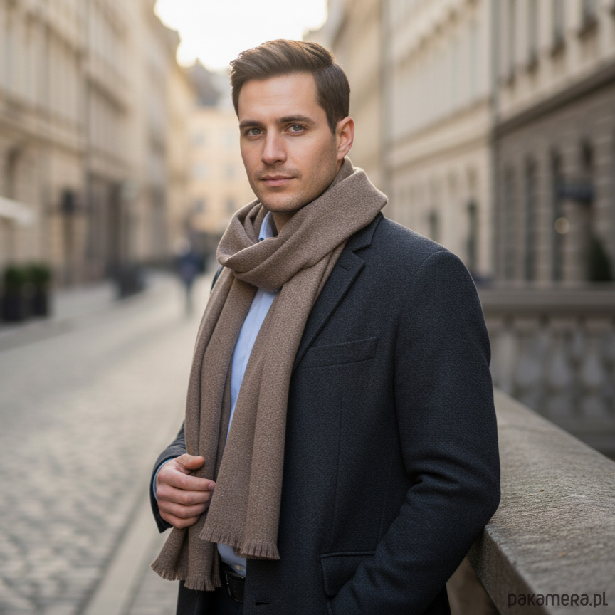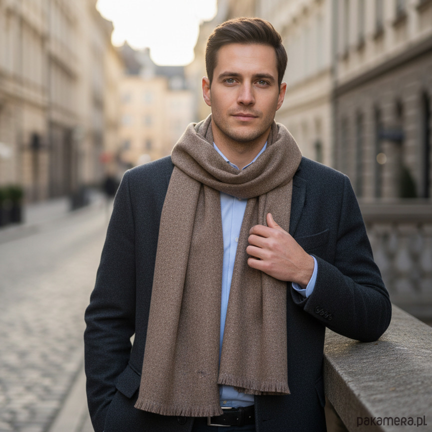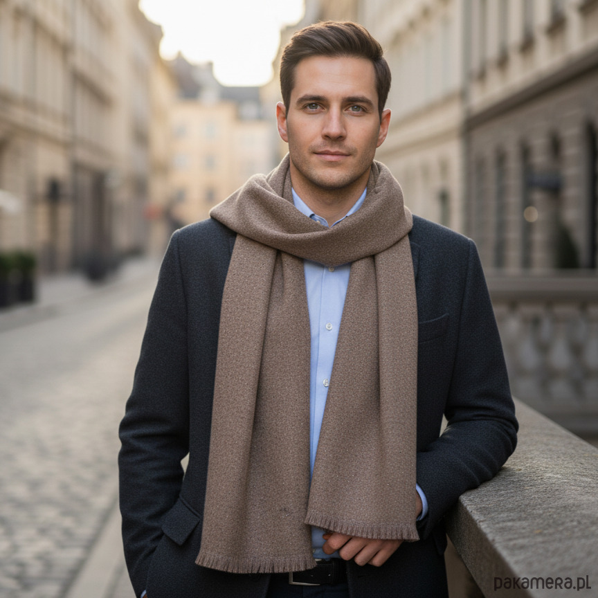 Szalik Męski szal 100% Wełniany JEDWAB beżowy CIENIOWANY SZARY