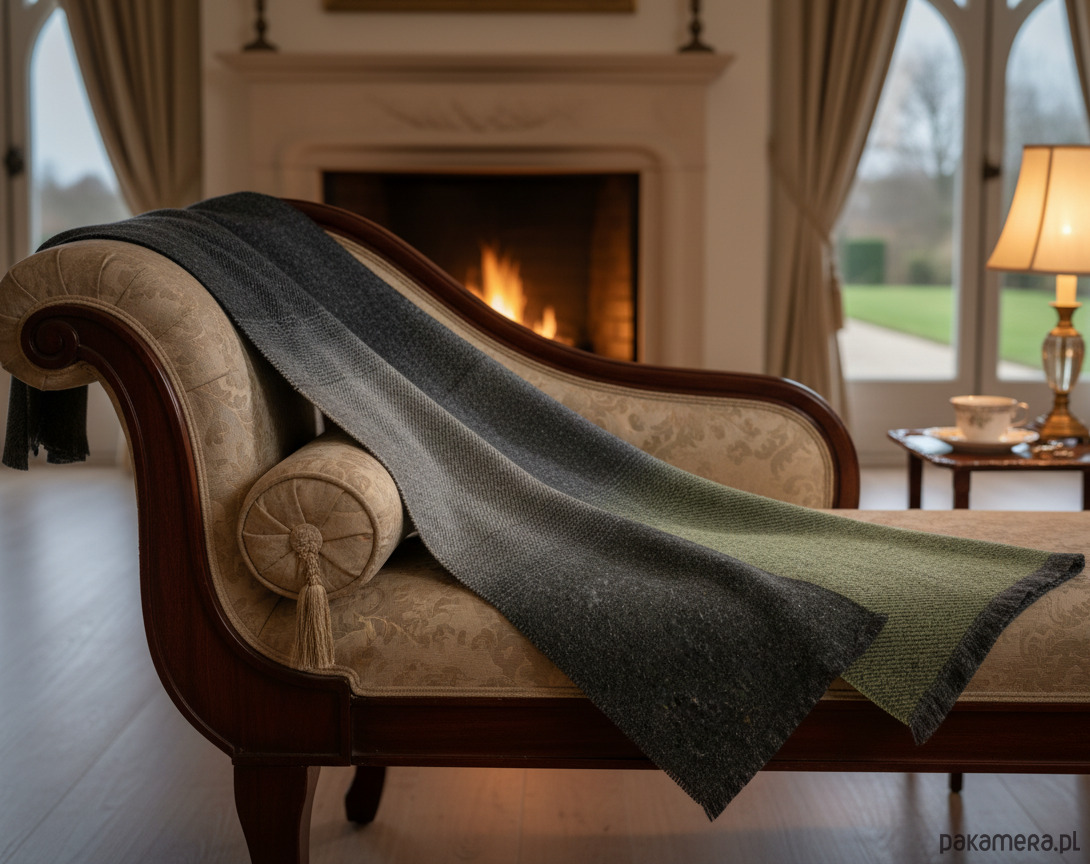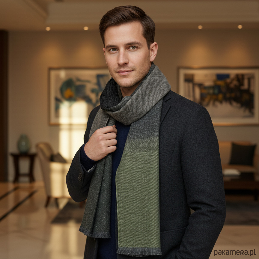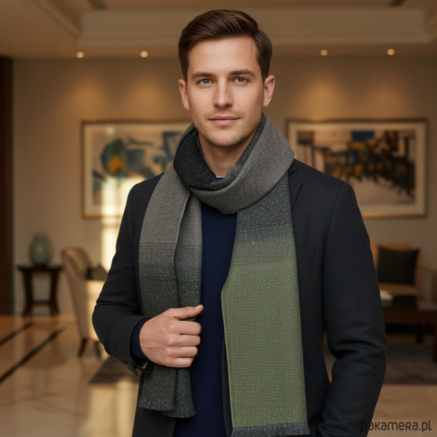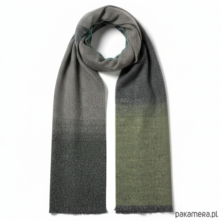 Szalik Męski szal 100% Wełniany JEDWAB zielony CIENIOWANY SZARY