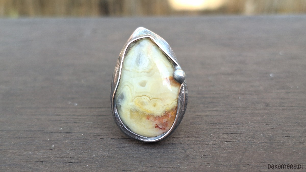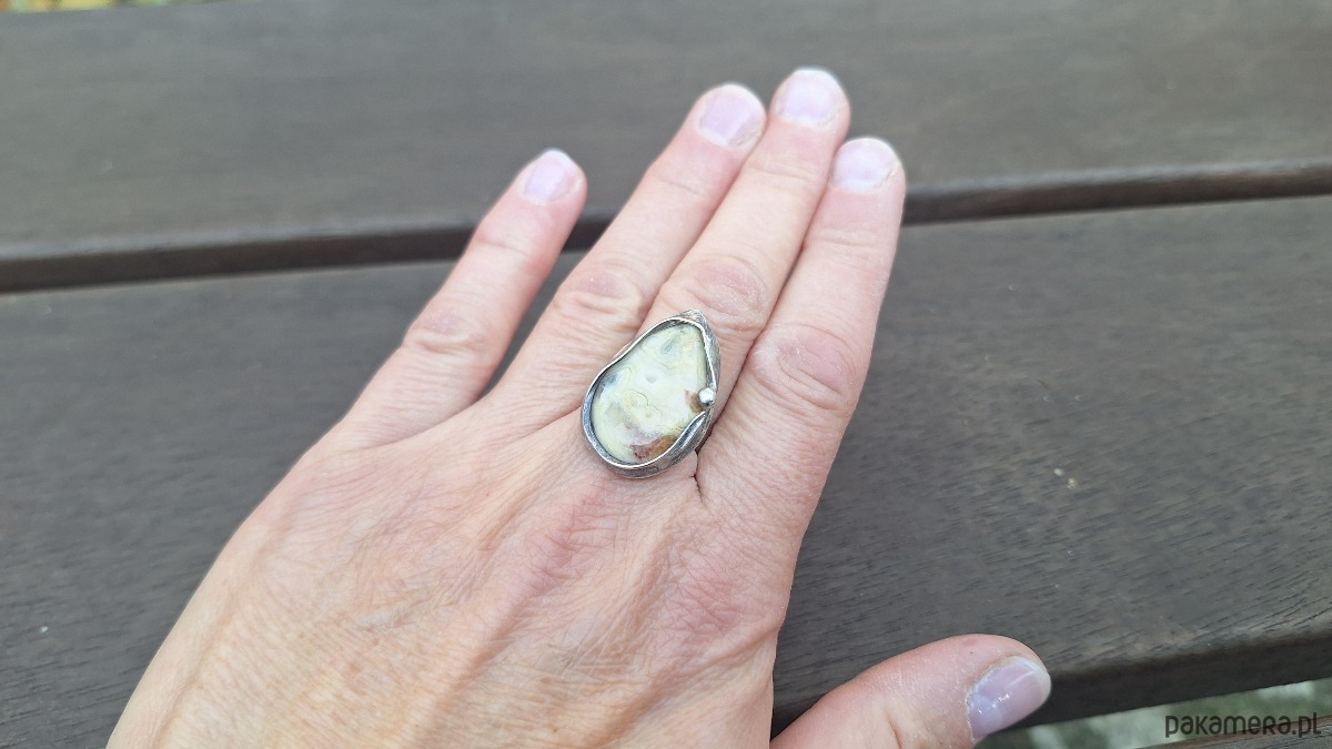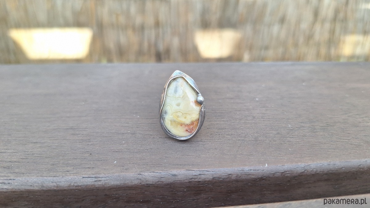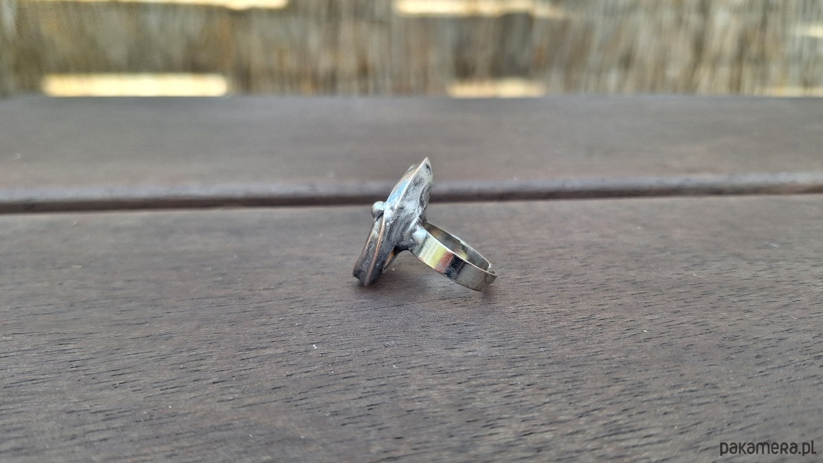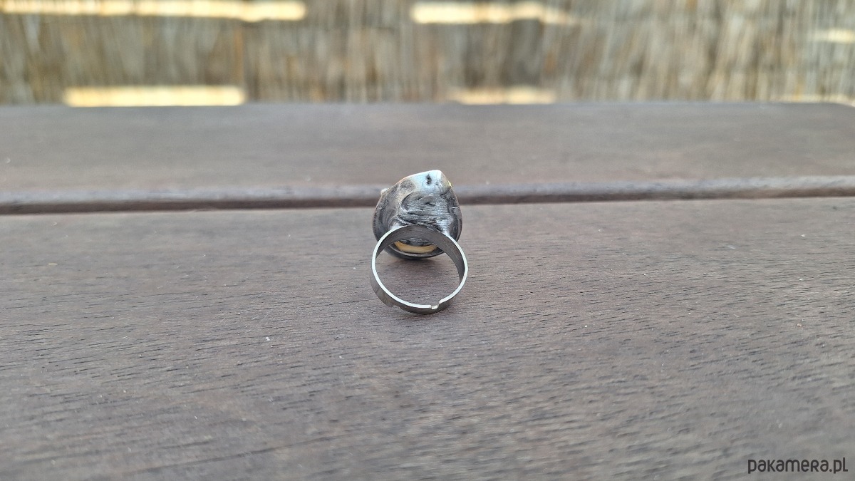 Pierścionek wykonany z miedzi, cyny i agatu. Wymiary ok. 2.5 na 1.7 cm. Regulowany. Nie jest ciężki.