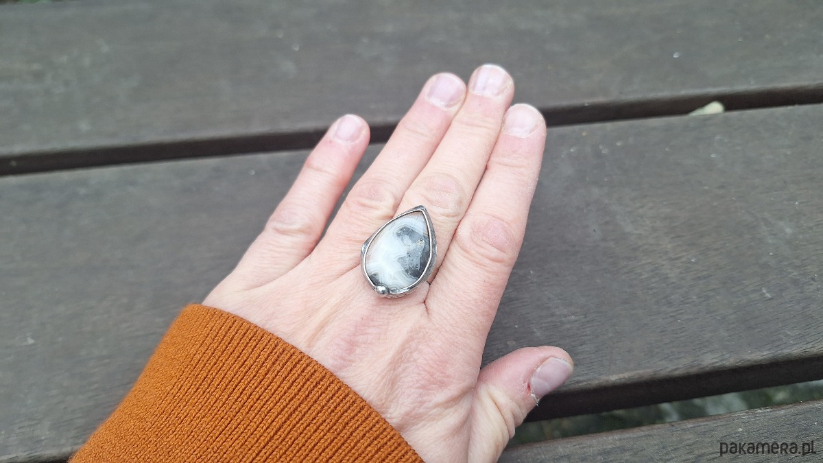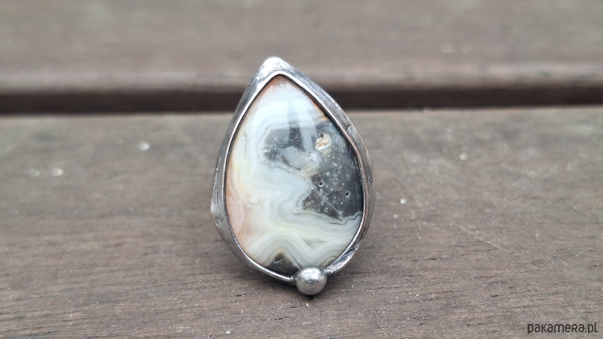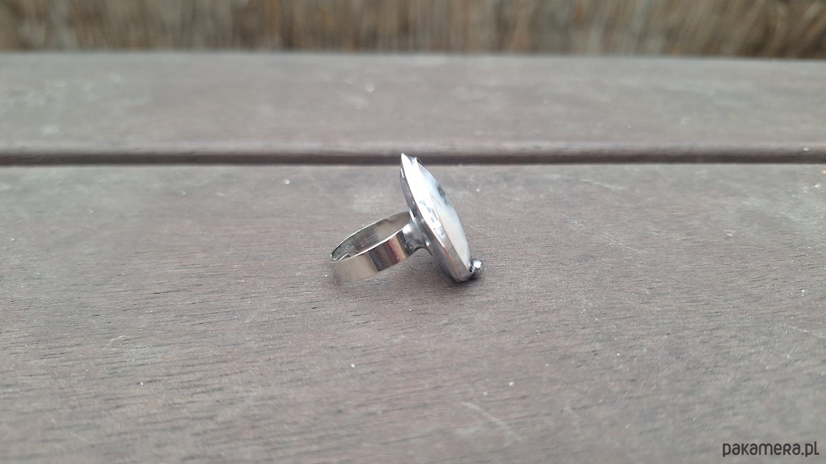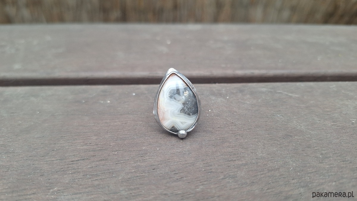 Pierścionek wykonany z miedzi, cyny i agatu. Wymiary ok. 2.5 na 1.8 cm. Regulowany. Nie jest ciężki.
