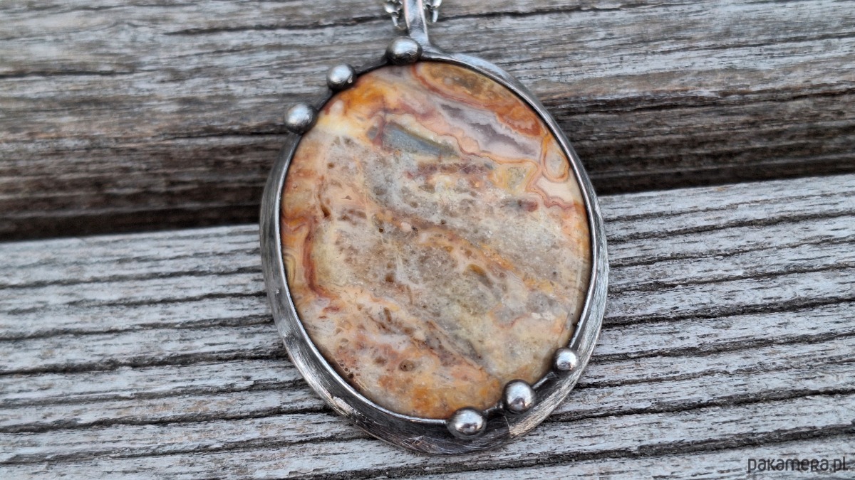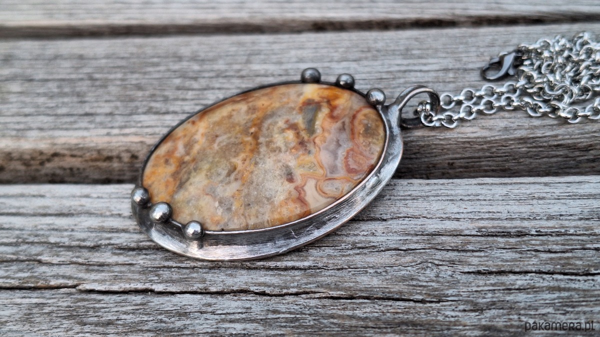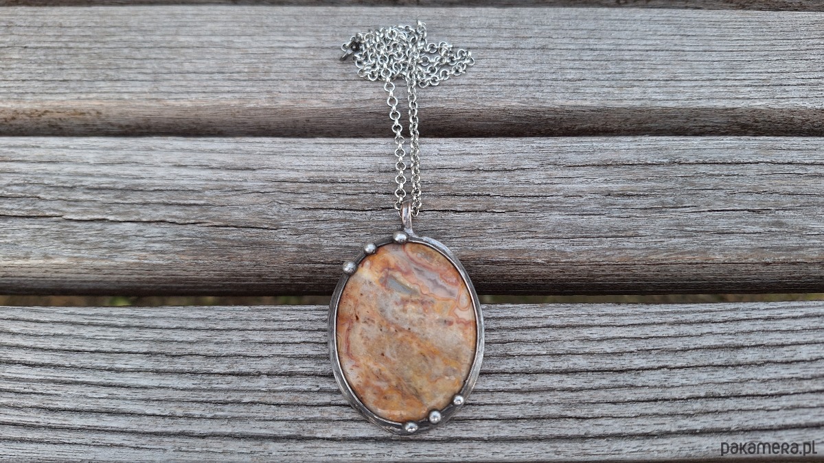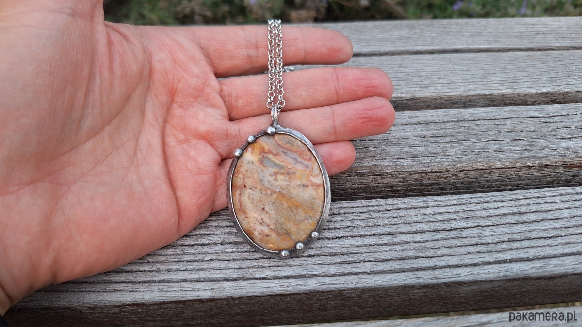 Wisiorek wykonany z miedzi, cyny i agatu crazy lace. Wymiary ok. 5 na 4 cm. Zawieszony na łańcuszku o długości ok. 50 cm.