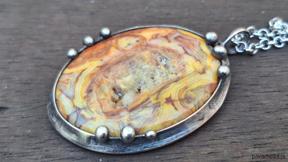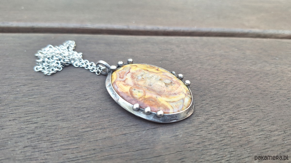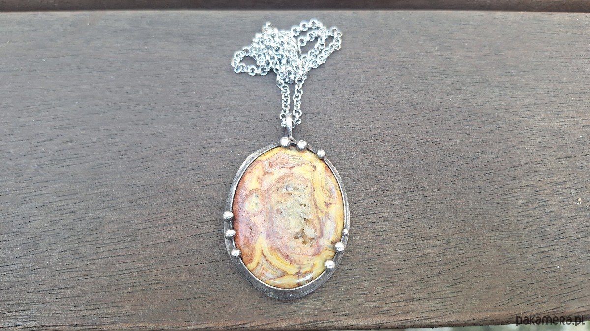 Wisiorek wykonany z miedzi, cyny i agatu crazy lace. Wymiary ok. 5 na 3.7 cm. Zawieszony na łańcuszku o długości ok. 50 cm.