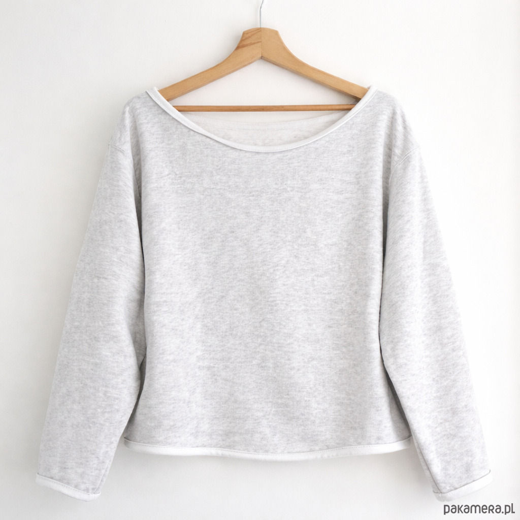 Surowe, cięte wykończenie dekoltu, rękawów i dołu bluzy. Uwaga! brak ściągaczy! Surowo: wyłażą nitki... ;)