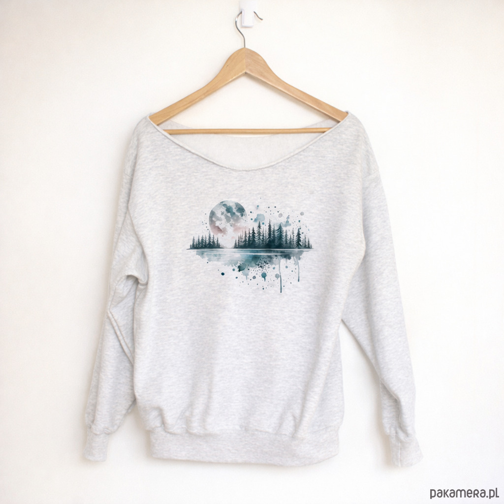 Nadruk cyfrowy. Szeroki dekolt. Cięte wykończenie dekoltu, zawija się w rurkę, rękawy i dół bluzy ze ściągaczami.