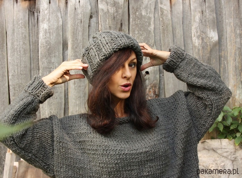 Ręcznie wykonana, gruba, mięsista czapka w kolorze szarym.